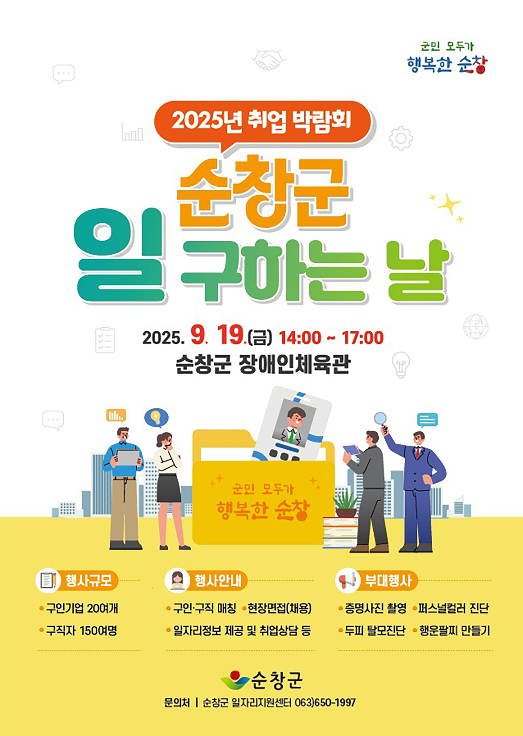 - 순창군이 지역 일자리 창출과 구직자 취업 지원을 위해 오는 9월 19일(금) 오후 2시부터 5시까지 순창군장애인체육관에서 ‘2025년 취업 박람회–순창군 일 구하는 날’을 개최한다. 이번 박람회에는 제조, 건설, 복지, 교육, 서비스 등 다양한 업종의 20여 개 기업이 참여해 현장에서 면접과 채용 상담을 진행하고, 간접참여 기업도 36개에 해당된다. 일부 기업은 월 300만 원 이상의 급여를 제시하며, 정규직 채용과 안정적인 복리후생을 제공하는 곳도 다수 포함돼 있다. 문의 경제교통과 일자리창출팀(☎ 650-1313, 1337) -2025년 9월 15일-