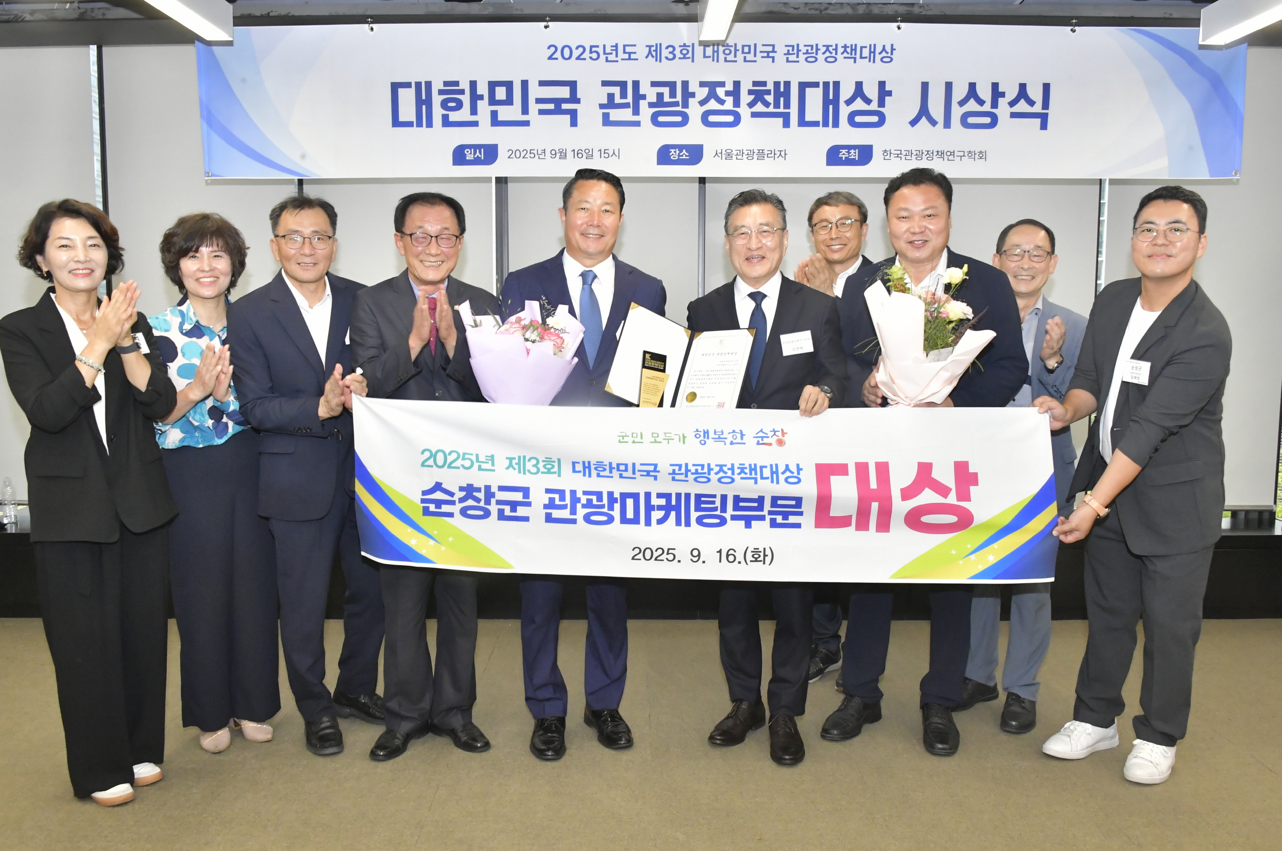 - 16일 한국관광정책연구학회가 주관한‘2025 제3회 대한민국 관광정책대상’에서 관광마케팅 부문 대상을 수상했다. 순창군은 전통 장 문화를 현대적 감각으로 재해석하고, 이를 다양한 관광 콘텐츠와 연결시켜 지역의 새로운 성장 동력으로 삼은 점에서 높은 평가를 받았다. 특히, 2023년 출범한‘순창발효관광재단’을 중심으로 진행된 ▲발효문화관광 마케팅, ▲순창장류축제 개최, ▲장류 캐릭터 및 굿즈 개발, ▲디지털 홍보 콘텐츠 제작 등 다각적인 전략을 높게 평가했다. -2025년 9월 16일-