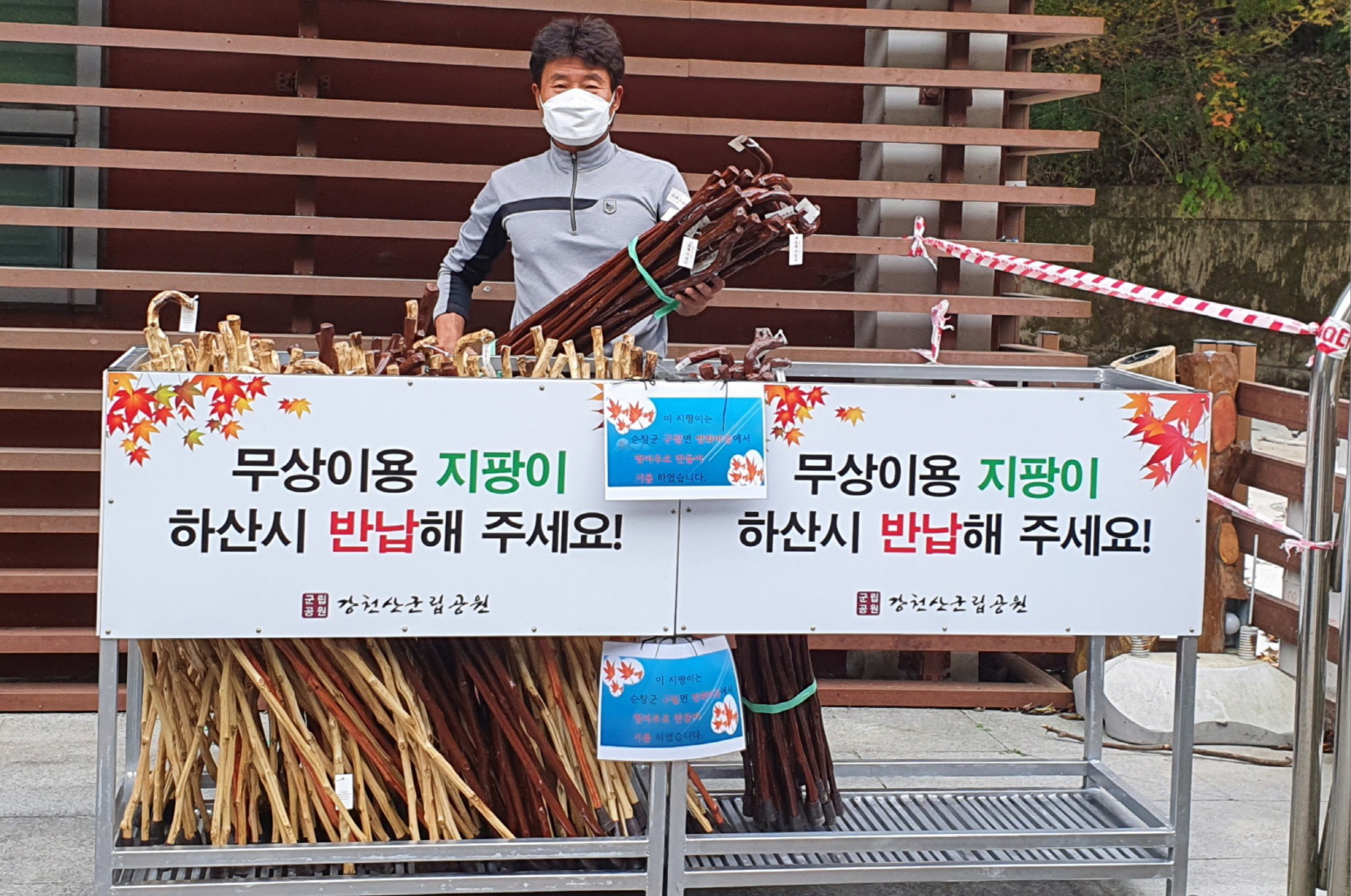 - “명아주”로 지팡이를 만들어 해마다 순창군 관내 노인들에게 기증해 오고 나머지는 강천산 군립공원을 찾는 관광객들에게 무료 대여하고 있다. . 구림면 방화마을 어르신들이 100여개의 지팡이를 만들어 강천산 등산객이 무료로 대여할 수 있게 400개를 기부했으며, 나머지 100개는 관내 어르신을 위해 사용됐다. -2020년 10월 20일-