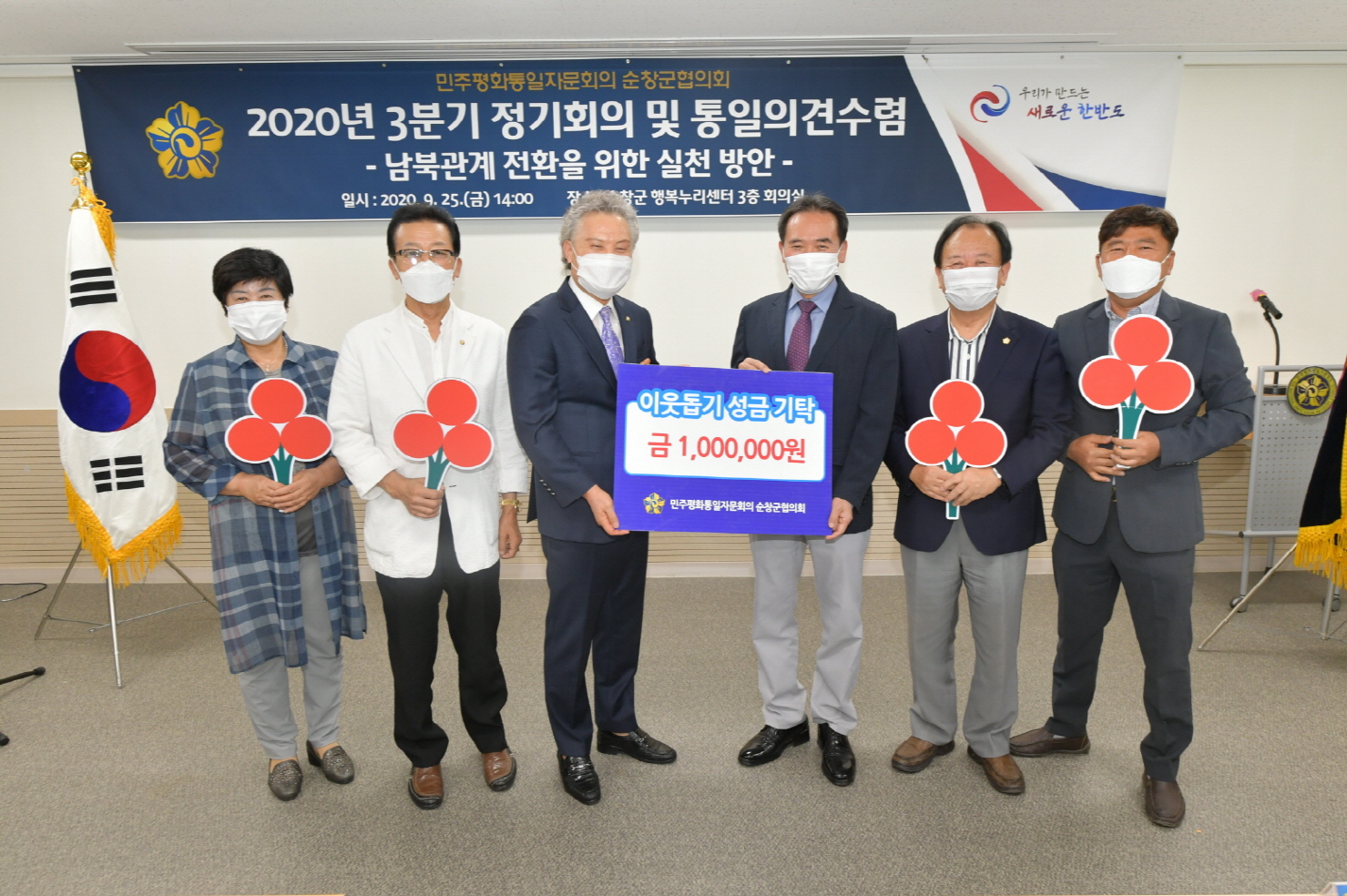 - 민주평화통일자문회의 순창군협의회(회장 윤영식)는 25일 추석 명절을 앞두고 지역의 어려운 이웃과 희망을 나누고자 불우이웃돕기 성금 100만원을 순창군에 전달했다. -2020년 09월 25일-