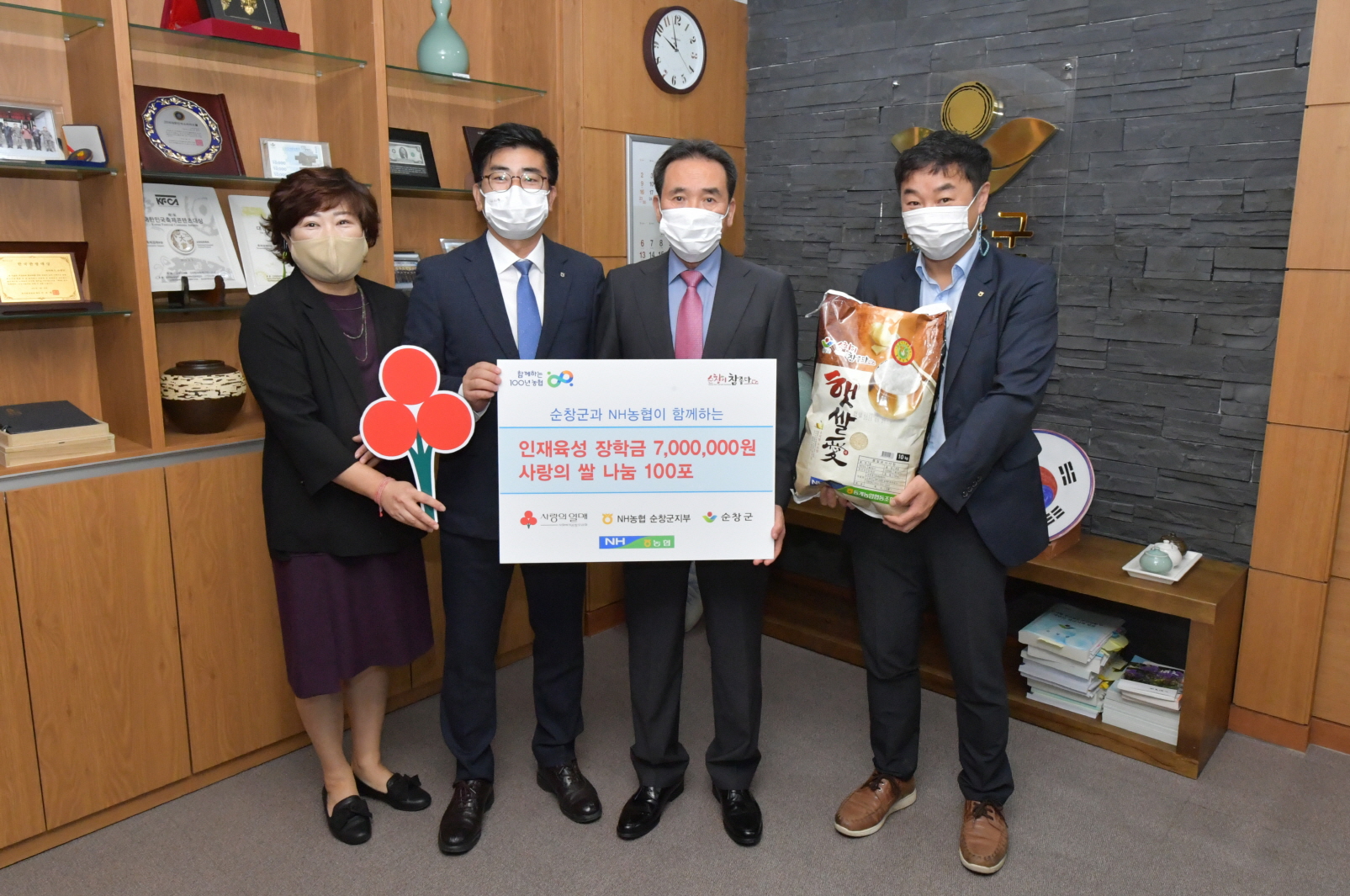 - NH농협 순창군지부(지부장 장경민)와 NH전북농협 지역사회공헌단(단장 박병철 노조위원장)은 22일 지역인재 양성과 교육발전을 위해 700만원의 장학금과 사랑의 쌀(10kg 100포, 현금 300만원 상당)을 순창군에 전달했다. -2020년 09월 22일-