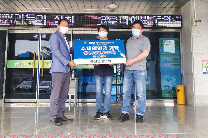 - 순창군 풍산면 청년회(회장 김윤영)는 28일 풍산면지역사회보장협의체에 호우 피해로 피해를 입은 풍산면 관내 주민들을 위해 수재 의연금 1,000천원을 기탁했다. 이번 기탁금은 집중 호우로 인해 수해를 입은 주민들에게 생필품을 전달하는데 쓰여질 계획이다. -2020년 08월 28일-