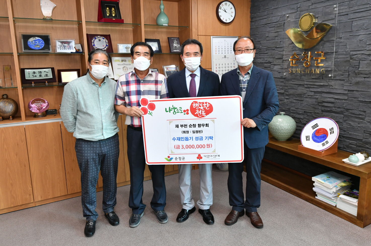 - 재부천 순창향우회는 28일 순창군청을 방문해 수해 피해를 입은 주민을 위해 써달라며, 성금 300만원을 기탁했다. 이날 기탁식은 순창군청 1층 군수실에서 열렸으며, 황숙주 순창군수와 재부천 순창향우회 임정빈 회장을 비롯해 임원진 등이 참석했다. -2020년 08월 28일-