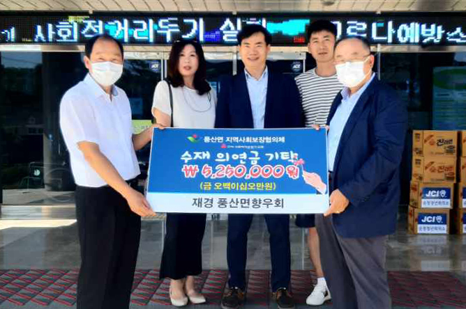 - 재경 풍산면향우회(대표 정삼용)는 호우 피해로 일상생활 재개에 어려움을 겪는 풍산면 관내 주민들을 위해 수재의연금 525만원을 고향을 방문해 직접 전달했다. 또한 (유)여남건설 100만원, (유)우신전업사 30만원, ㈜일성전기 20만원, 한사마을 박형남 20만원, 돈오농장 20만원, 풍산면행정복지센터 직원 상조회 30만원, 순창읍 청년회에서 선풍기 15대와 라면 15박스를 기탁해줬다. -2020년 08월 26일-