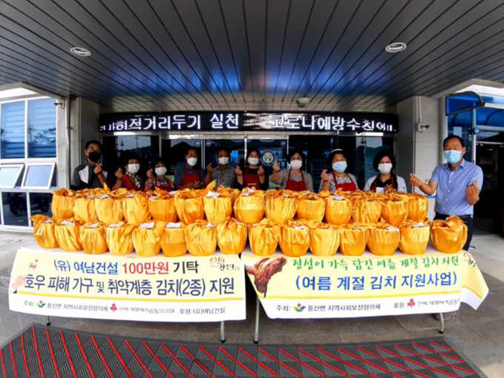 - 풍산면 지역사회보장협의체(위원장 김정숙)는 27일 정성이 가득 담긴 사랑의 김치 전달을 실시했다. 이번 봉사활동은 (유)여남건설(대표 김문숙)에서 기탁한 성금 100만원으로 진행됐다. 풍산면 지사협은 특히 이번 호우피해를 입은 가구를 중심으로 경제적 어려움 등 김장이 어려운 풍산면 관내 주민 55가구에 김치 2종(배추김치, 물김치)를 전달했다. -2020년 08월 27일-