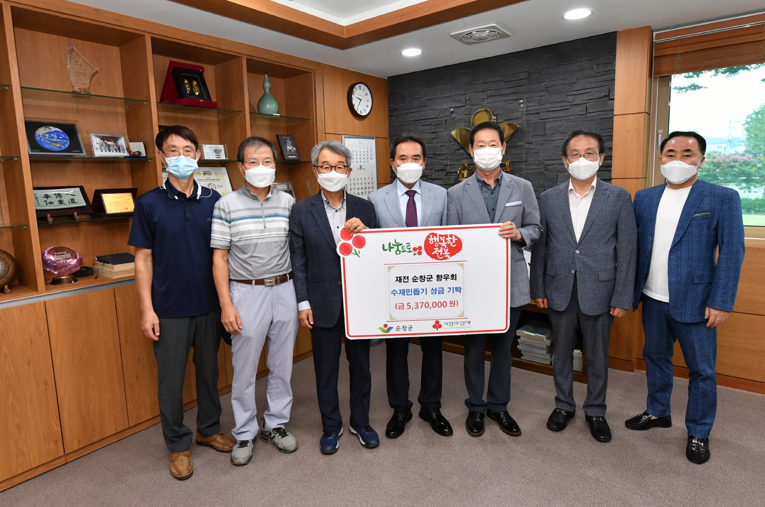 - 재전순창군향우회(회장 김용군)는 27일 순창군청을 방문해 수해 피해로 힘든 시기를 겪고 있는 수해민에 써달라며 성금 537만원을 기탁했다. 기탁된 성금은 전북사회복지공동모금회를 통해 수해 피해를 입은 주민들을 위해 지원될 예정이다. -2020년 08월 27일-