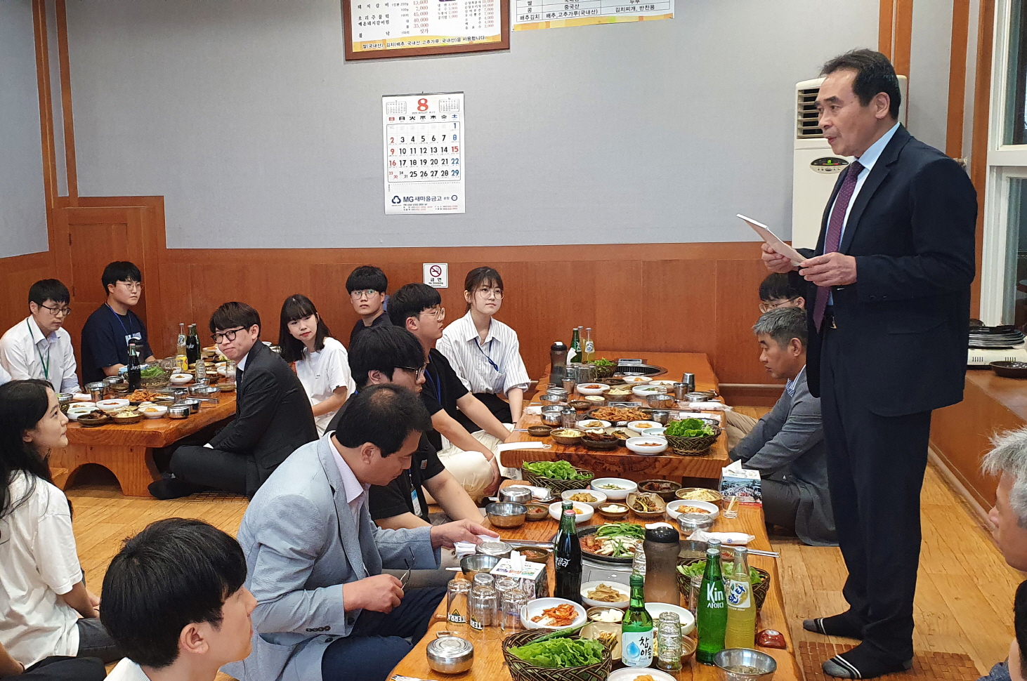 - 황숙주 순창군수는 6일 관내 모 식당에서 대학생 행정인턴으로 참여한 16명의 대학생들과 대화의 시간을 가졌다. 이날 만남은 지난 7월 13일부터 시작한 대학생 행정인턴사업이 8월 7일로 종료됨에 따라 인턴들과 소통의 시간을 갖기 위해 마련됐다. -2020년 08월 07일-