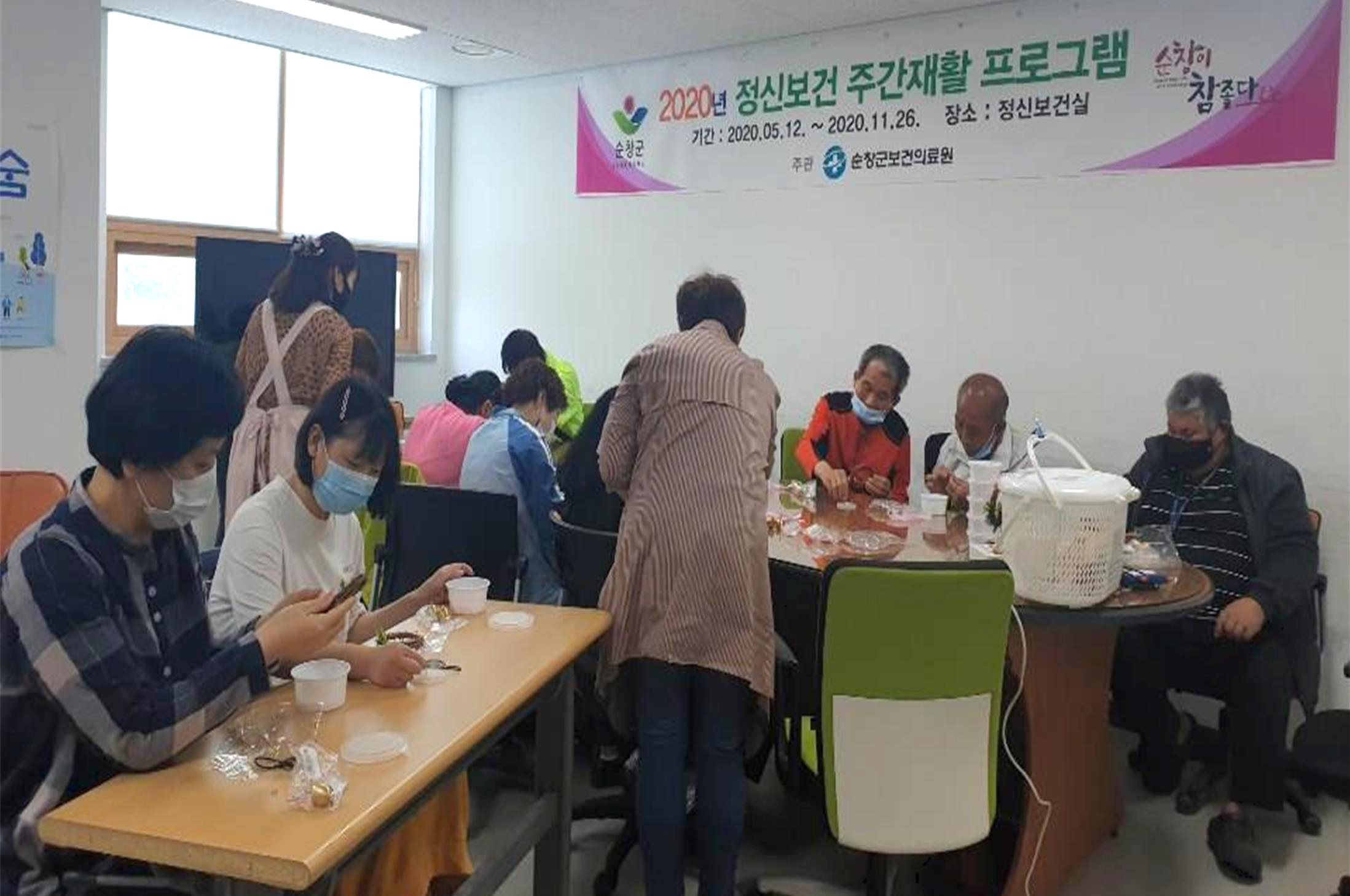 - 순창군 보건의료원 정신건강복지센터(센터장 정영곤)는 관내 등록 정신질환자를 대상으로 한 주간재활 프로그램을 운영해 정신장애우와 가족들로부터 큰 호응을 얻었다. 이 프로그램은 지난 5월 12일부터 7월 23일까지 매주 2회씩 총 22회 운영됐으며 재활 요법, 예술요법, 여가활동, 약물·증상관리 교육 등 다양한 주제로 진행됐다. -2020년 07월 27일-