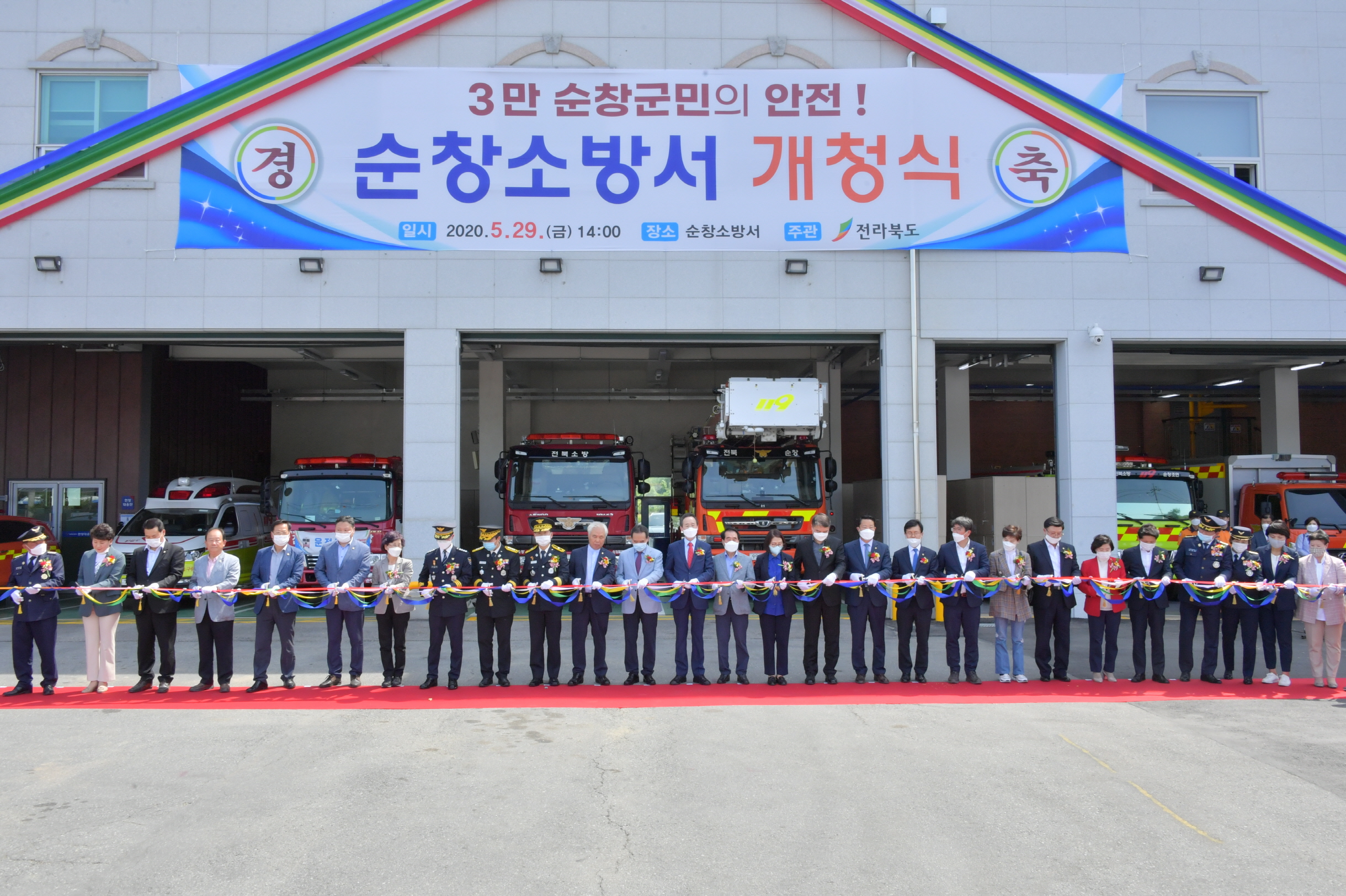 - 순창소방서가 29일 송하진 전북도지사, 홍영근 전북소방본부장 및 황숙주 군수 및 각급기관 단체장 등 150여명이 참석한 가운데 개청식을 갖고 본격 업무에 들어갔다. 순창소방서는 순창읍 교성로 5,473㎡부지에 연면적 2,595㎡로 신축된 순창소방서는 지상 3층 규모로 건축됐으며 소방공무원 129명과 소방차 22대 등의 장비를 배치하고 2과 ・ 1단 ・ 1안전센터 ・ 1구조대 ・ 4지역대로 증강 개편됐다. -2020년 05월 29일-