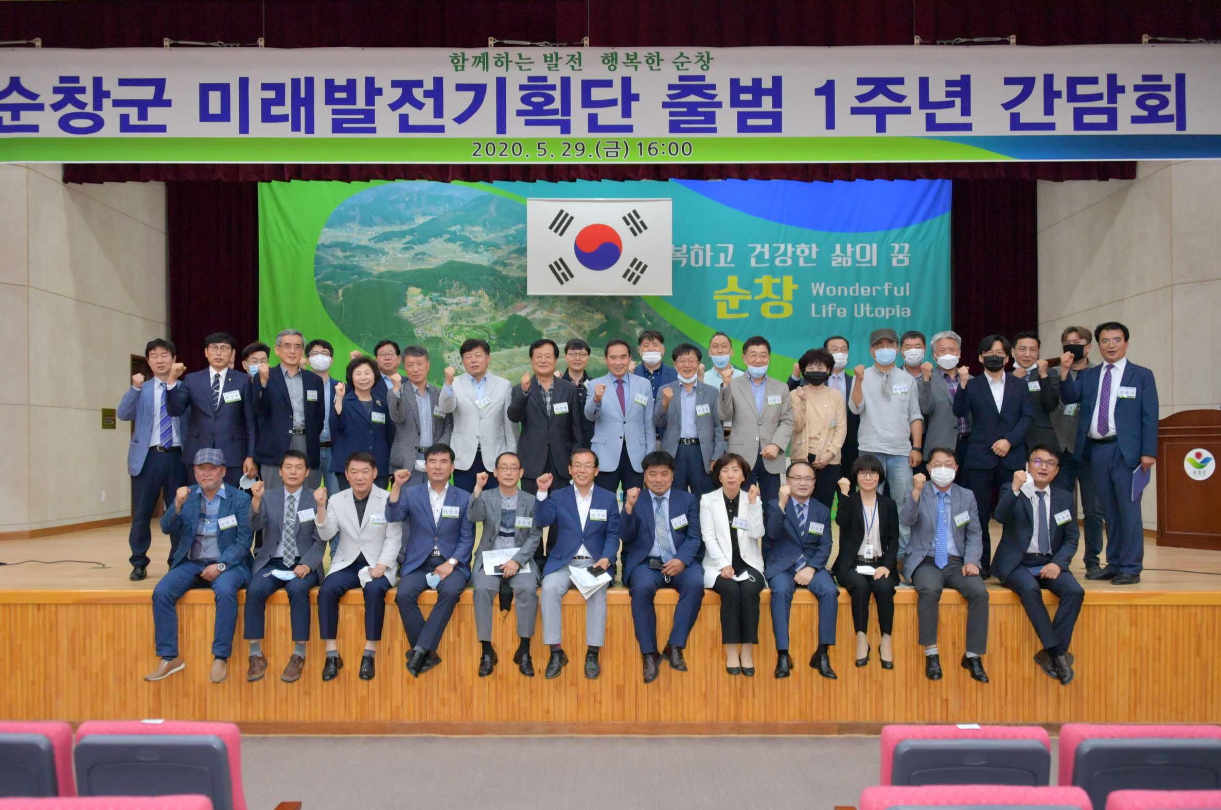 - 순창군의 씽크탱크인 미래발전 기획단이 29일 출범 1주년을 맞아 건강장수사업소에 모였다. 순창군은 코로나19 확산을 염려해 `생활 속 거리두기` 방역지침을 준수하며, 참석한 위원들간 최대한의 거리를 두고 간담회를 진행했다. 이 자리에 황숙주 순창군수를 비롯해 미래발전 기획단 위원 23명, 군 정책동아리 대표 10명 등 총 40여명이 함께했다. 이날 간담회는 ‘순창발전 미래 비전사업’을 발표하는 시간을 시작으로, 치유테마공원 조성계획 발표, 코로나19 이후 순창군의 대응방안 등에 대한 열띤 토론을 열며 뜻 깊은 시간을 가졌다. -2020년 05월 29일-