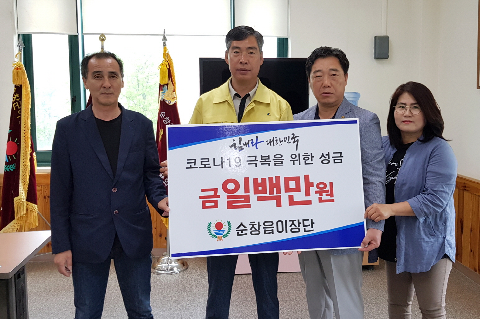 - 순창읍이장협의회(회장 김영)는 지난 19일 순창읍 행정복지센터를 방문해 코로나19 극복을 응원하는 성금 100만원을 기탁했다. 이번 성금은 순창읍이장협의회가 지난 13일 이장회의에서 십시일반 모은 성금을 이날 기탁하게 됐다. -2020년 05월 19일-