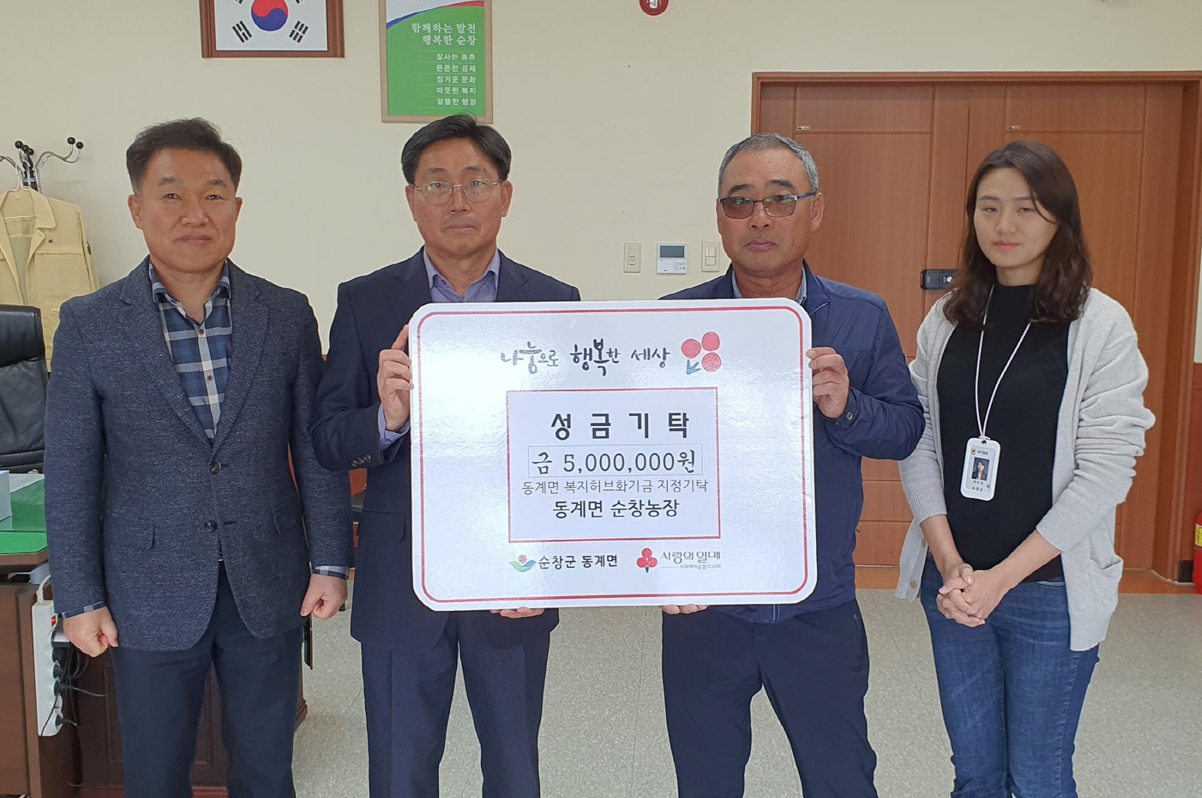 - 순창농장(대표 노진석)은 지난달 계란기부와 성금 기부에 이어 또 다시 성금 5백만 원을 동계면 복지허브화기금으로 기탁하여 귀감이 되고 있다. 순창농장 나재규 전무는 동계면 행정복지센터를 방문해 성금 500만원을 기탁했다. -2020년 05월 11일-