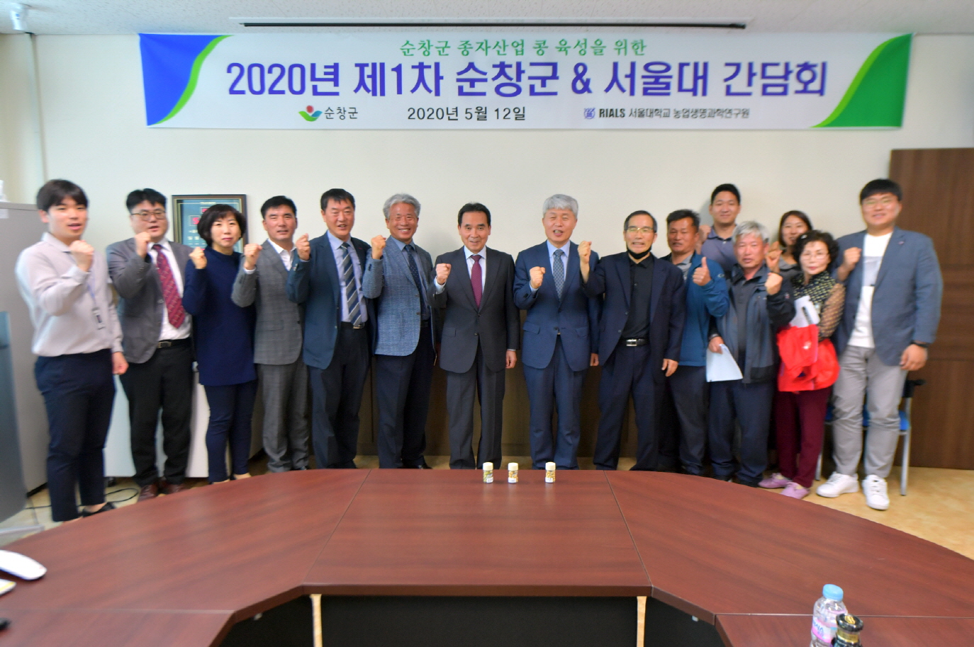 - 12일 순창군 농업기술센터 2층 회의실에서 콩 종자개발을 위해 진행 중인 프로젝트의 올해 1차 간담회가 열렸다. 이날 간담회에는 황숙주 순창군수를 비롯해 서울대학교 농업생명과학원 이석하 원장, 관련 연구원과 공무원 등 총 20여명이 참석했다. 군은 지난 2018년 11월 서울대학교 농업생명과학원과 업무협약을 맺고, 순창 기후에 적합한 우량 콩 품종을 개발하고 있다. -2020년 05월 11일-