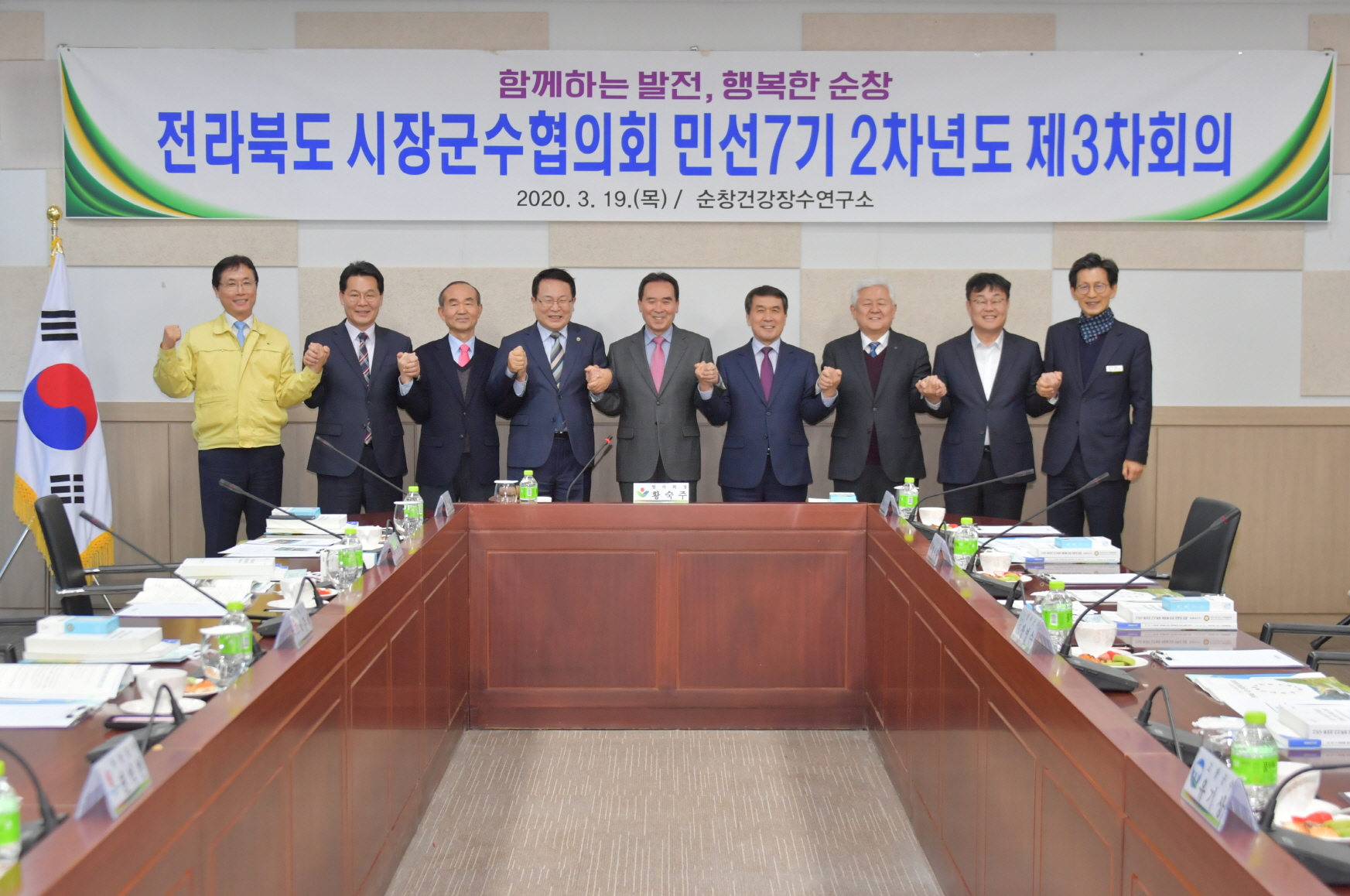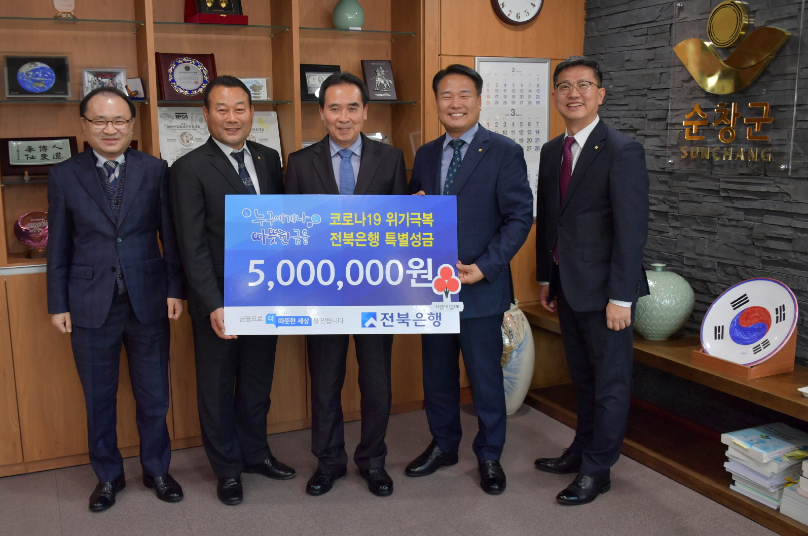 - 전북은행 순창지점(지점장 이창훈)은 24일 순창군청을 방문해 코로나19 위기 극복 성금으로 5백만 원을 기탁했다. 이날 기탁식에는 전북은행 임재원 부행장, 고찬배 익산지역센터장. 이창훈 순창지점장 등이 참석해 코로나19로 어려움을 겪고 있는 순창군민에게 작지만 위로와 희망을 선물했다. -2020년 03월 24일-