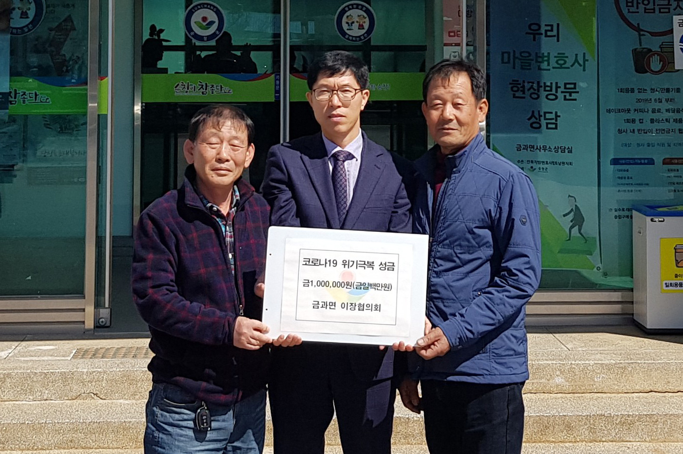 - 금과면 이장단협의회(회장 손현기)는 11일 금과면행정복지센터를 방문해 코로나19 극복에 도움이 되고자 성금 100만원을 전달했다. -2020년 03월 11일-