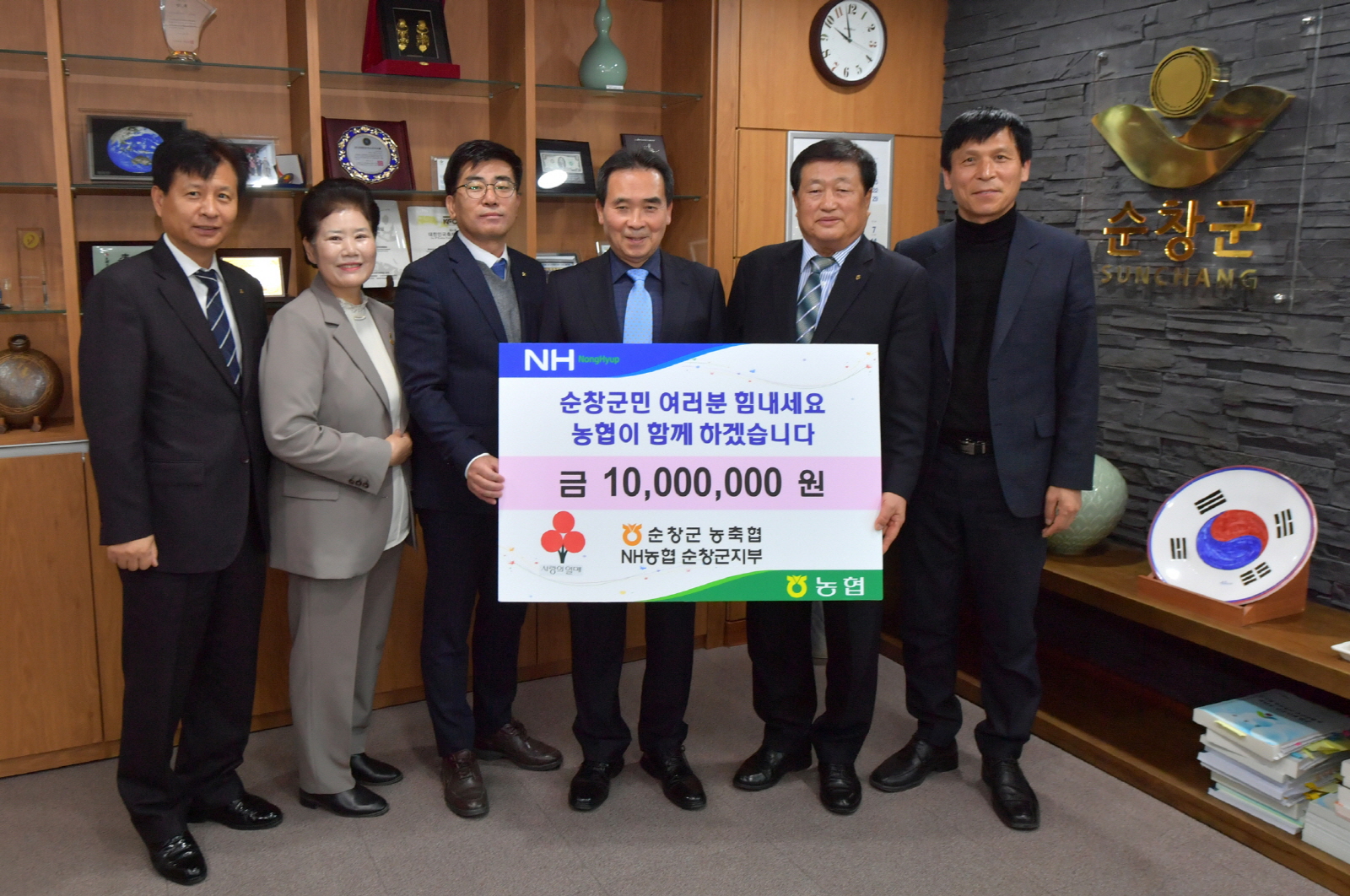 - 농협중앙회 순창군지부와 순창군 관내 농.축협은 13일 순창군청을 방문해 코로나19로 인한 경기위축 등으로 어려움에 처한 불우이웃을 위해 써달라며, 성금 1000만원을 전달했다. -2020년 03월 13일-