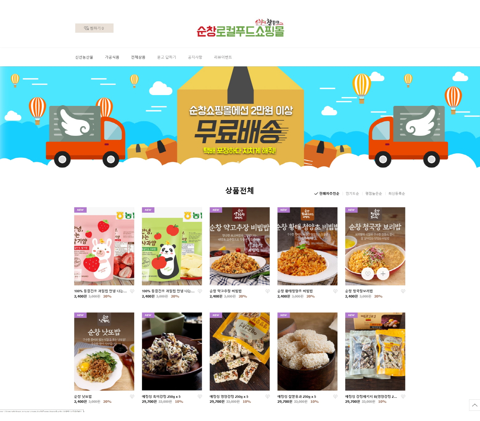 - 순창군은 16일 대표 포털사이트 네이버에서 제공하는 스마트스토어에 `순창 로컬푸드 쇼핑몰`을 개설해 로컬푸드 직판장에서 판매하는 30여개 제품을 등록하고 판매에 들어간다. 이와 더불어 순창군과 농업기술센터 홈페이지, 그리고 로컬푸드 납품을 담당하는 개별 농가.단체의 농특산물 판매 홈페이지(배너)를 링크, 연계하는 등 온라인망 확대에 주력한다. -2020년 03월 16일-