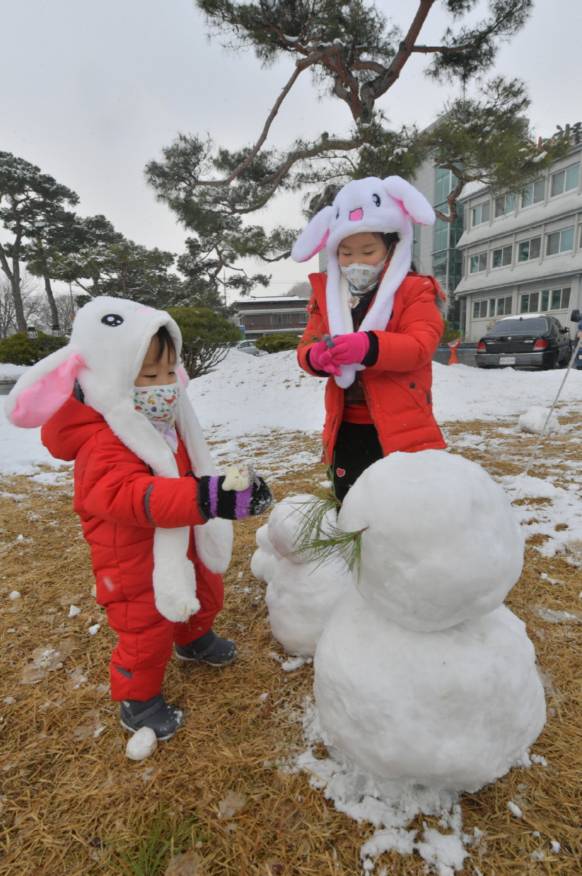- 17일 2020년 순창군청 잔디광장에도 첫눈이 쌓였다. 신나게 만든 눈사람에 아이들이 눈코입을 만들고 있다. -2020년 02월 17일-
