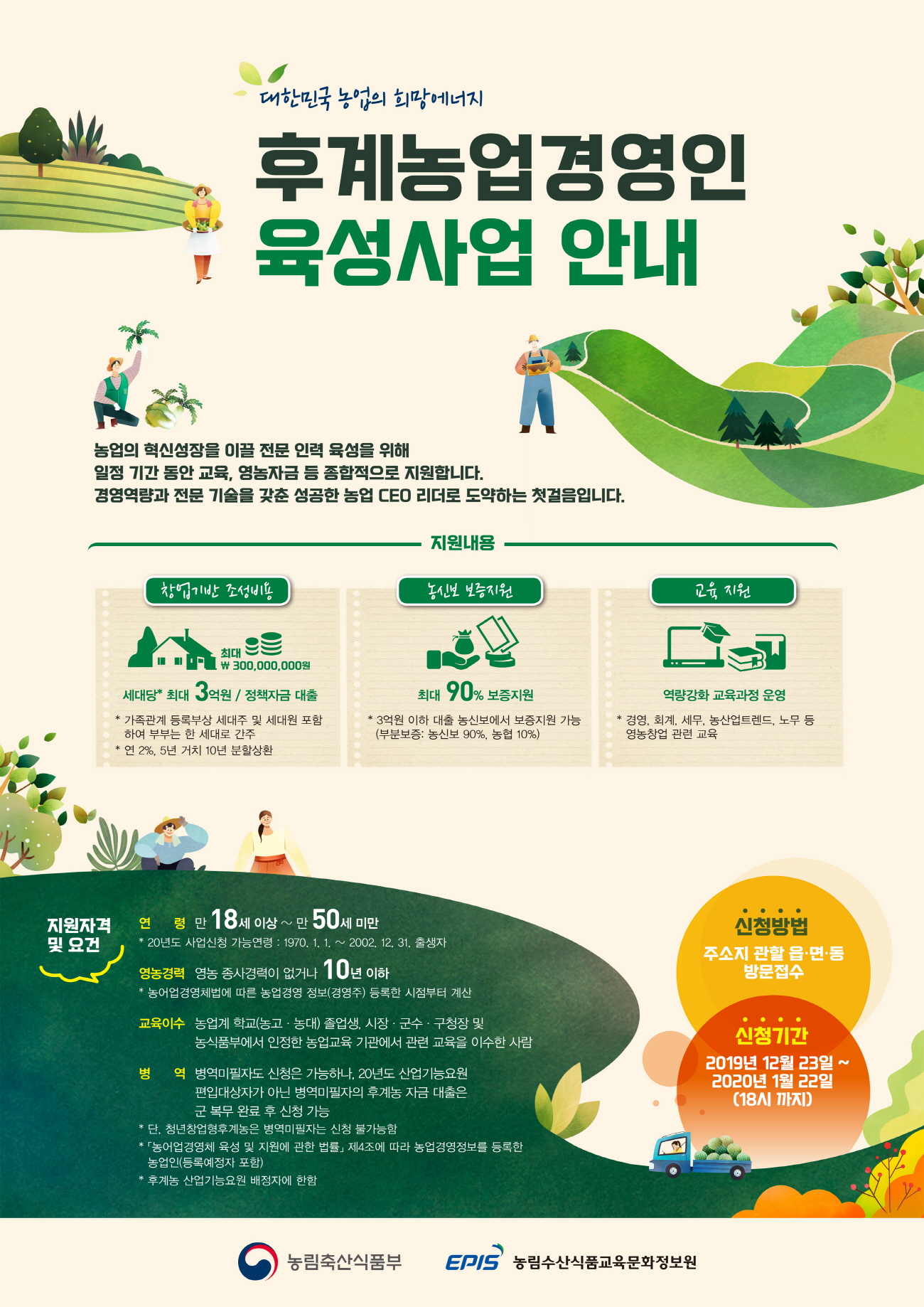 - 오는 22일까지 주소지를 관할하는 읍면 행정복지센터에서 후계농업경영인 신청을 받는다. 신청자격은 만 18세 이상부터 만50세 미만까지며, 영농에 종사한 경력이 없거나 10년 이하여야 하며, 대학의 농업 관련 학과나 농업계 고등학교를 졸업하였거나 시장·군수·구청장이 인정한 농업 교육기관에서 관련 교육을 이수한 자여야 한다. 후계농업경영인으로 선발되면 자금지원과 교육지원 등이 뒤따른다. 우선 후계농업경영인으로 선정된지 5년 이내인 자를 대상으로 세대당 최대 3억원까지 금리 2%로, 5년 거치 10년 분할 상환방식의 금융지원을 받을 수 있다. -2020년 1월 3일-