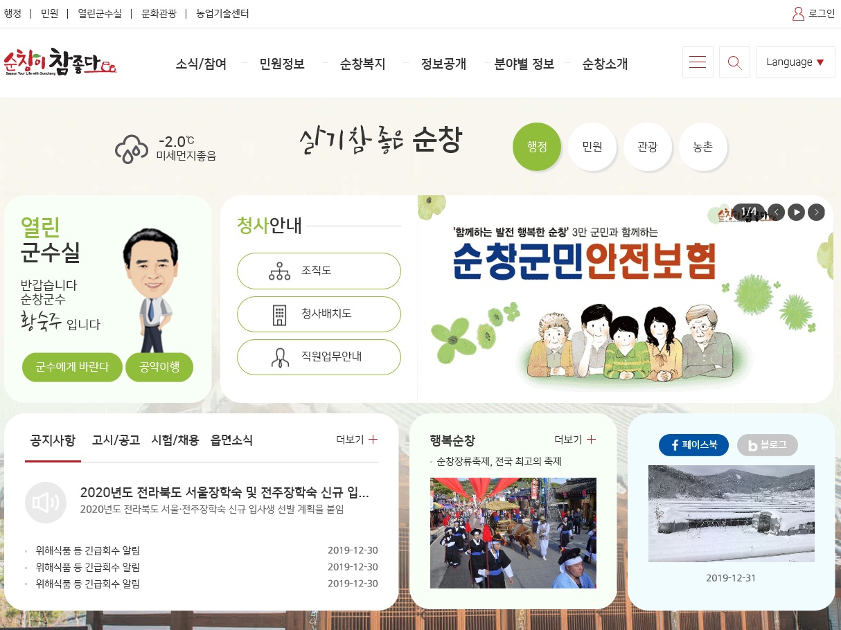 - 순창군이 대표홈페이지를 새단장하여 3일부터 본격 서비스를 시작한다. 지난해 5월부터 ‘스마트 통합 홈페이지 구축 사업’을 추진하여 순창군에서 운영 중인 주요 홈페이지를 통합하고, ‘반응형 웹’으로 전면 개편했다. 반응형 웹은 스마트폰, 태블릿, PC 등 어느 기기에서든 기기에 맞게 자동으로 최적화된 크기로 디자인이 변경되어 동일한 내용을 볼 수 있는 기술로 이용자가 원하는 정보를 편리하고 빠르게 접근할 수 있도록 했다. -2020년 1월 3일-