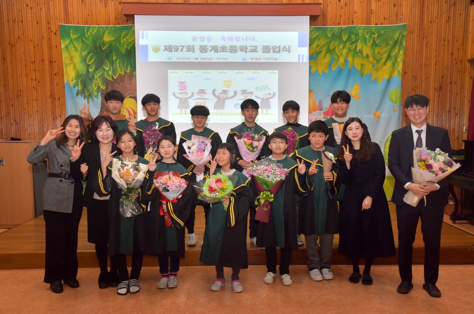 - 순창 동계초등학교(교장 박진현)는 3일 제97회 졸업식이 시청각실에서 11명이 졸업생과 선생님, 동계면 기관사회단체장, 학부모 등 100여명이 참석한 가운데 열렸다. 2020년 순창에서 첫 졸업식이 열린 이날 11명의 학생들은 선생님과 함께 마지막 추억을 담으며 환하게 웃고 있다. -2020년 1월 3일-