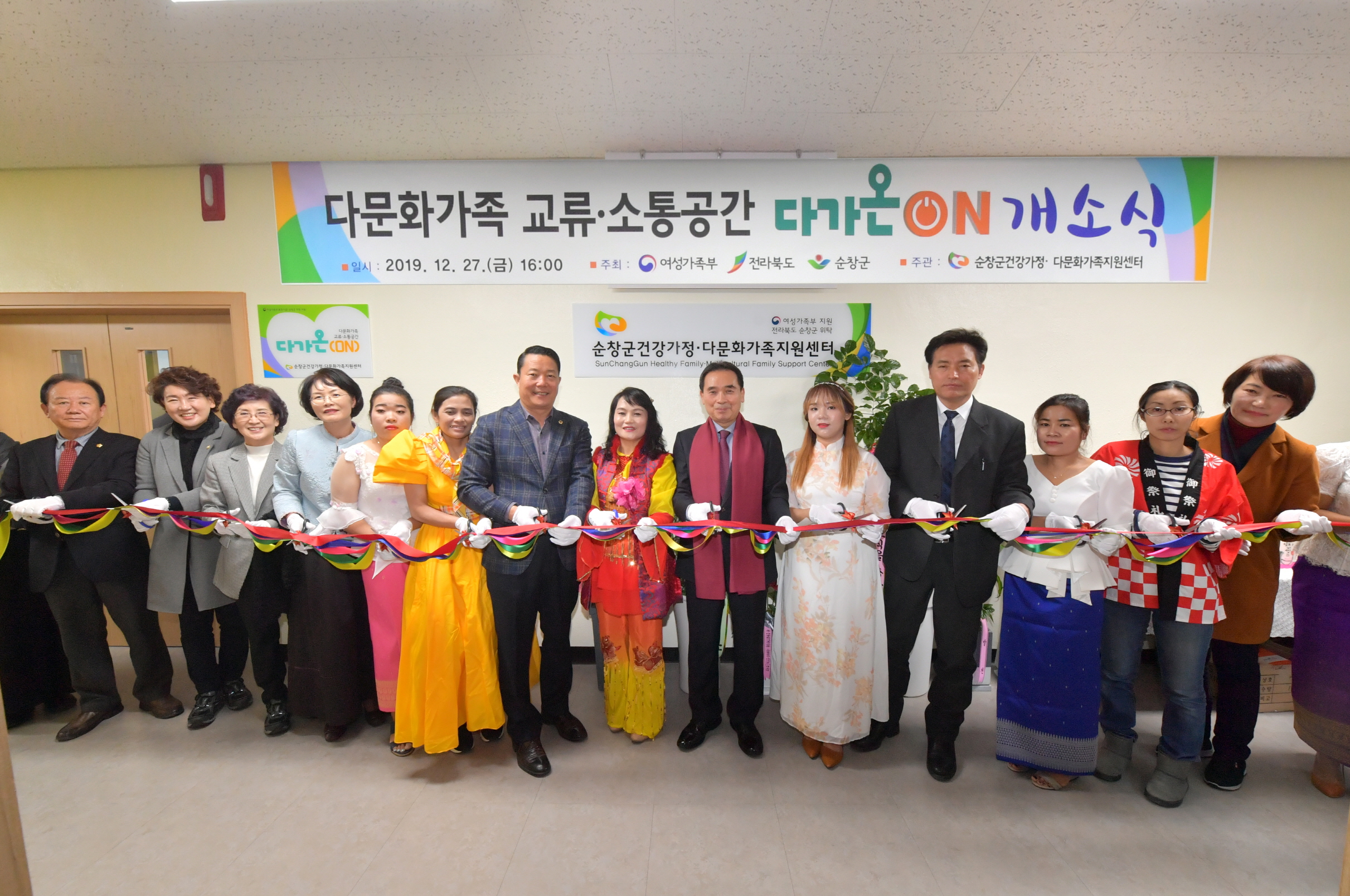 - 행복누리센터에 둥지를 튼 다문화가족의 교류와 소통 공간인 ‘다가온(ON)’ 개소식이 27일 열렸다. ‘다가온(ON)’은 순창군 행복누리센터 3층에 조성됐으며, 내부에는 요리공간, 자조모임 공간, 수유실 등을 갖추고 있다. -2019년 12월 27일-
