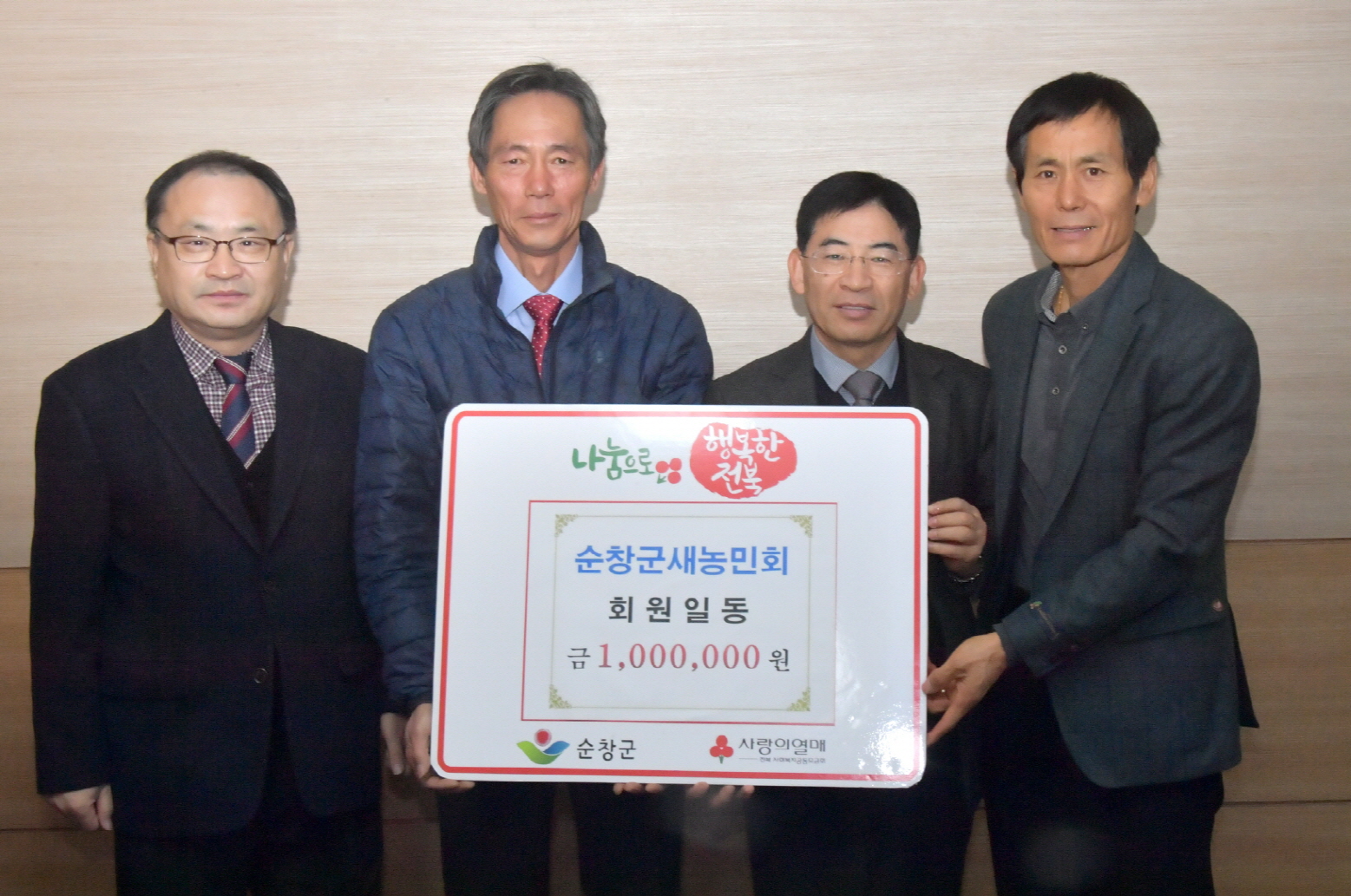 - 순창군새농민회(회장 임형락)는 30일 순창군을 방문하여 100만원을 기탁했다. 기탁된 성금은 관내 어려운 수급자, 차상위, 장애인 등 취약계층을 위해 쓰여질 예정이다. -2019년 12월 30일-