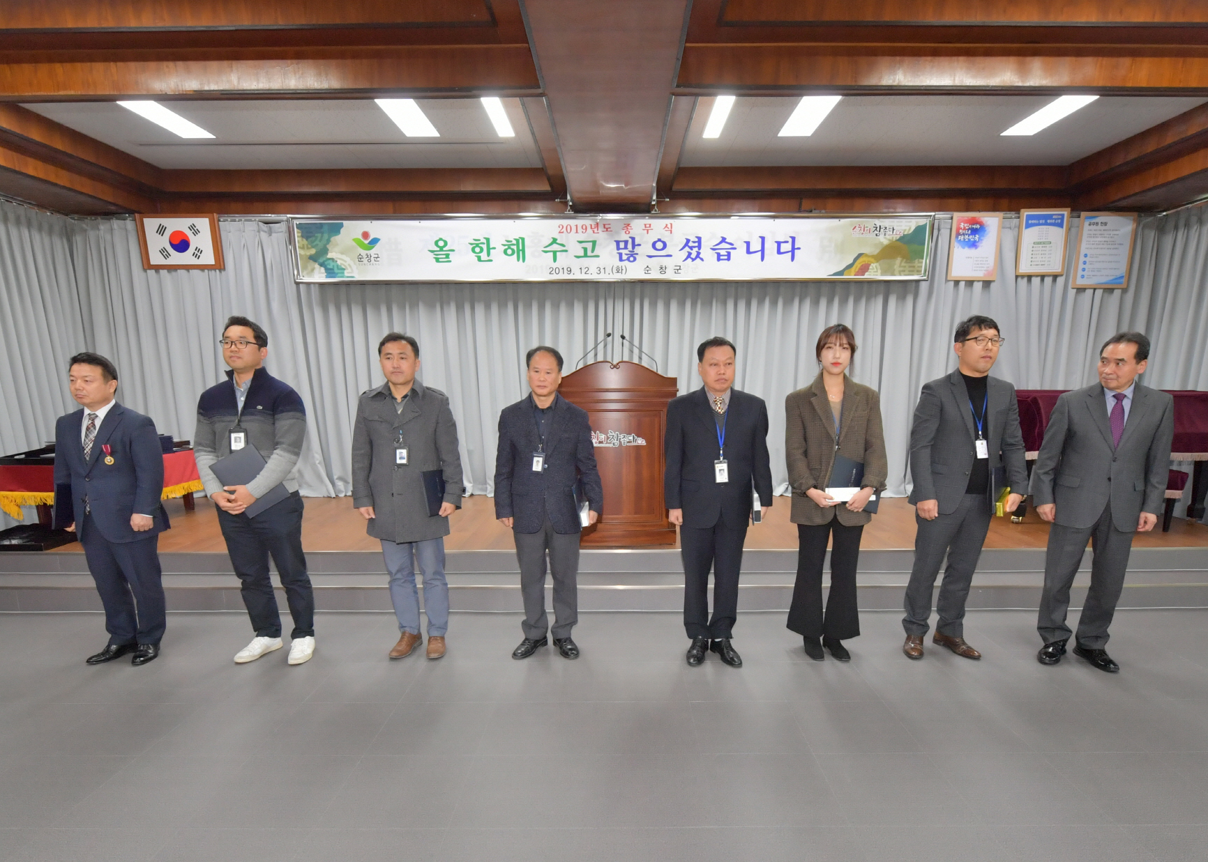 - 다사다난했던 2019년도 종무식이 군청 영상회의실에서 민간인 수상자와 군산하 공무원이 참석한 가운데 열렸다. 이날 한해를 마무리하고 황숙주 군수의 송년사와 군민의 노래를 제창하며 새해를 다짐하는 시간을 가졌다. 기획예산실 김윤석 감사담당이 국무총리 모범공뭔 표창, 이규열, 송경석, 권일수, 이창규, 서장은씨 등이 각부처 장관표창을 전수 했다. 이어 섬진강 강천산 전국 사생공모전 입상자, 도정발전 유공자, 모범공무원 시상이 이어졌다. 또 하반기 제안공모 입상자 시상, 순창군 UCC 공모전 시상, 군정발전 유공자 표창과 감사패를 수여 했다. -2019년 12월 31일-