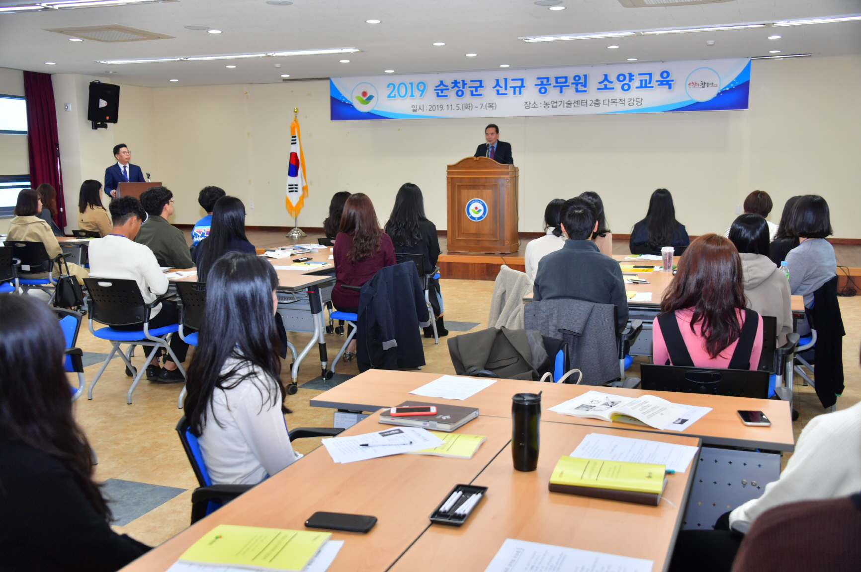 - 순창군이 5일부터 3일간에 걸쳐 농업기술센터 교육장에서 올해 공직에 임용된 신규 공무원 46명을 대상으로 직무능력 향상과 공직사회 적응을 위한 진행한 위탁교육을 마무리했다. 이번 교육은 기획과 예산, 공무원의 의무·금지사항, 인사, 복무 및 문서작성 등 신규 공직자가 꼭 알아야 할 실무지식 습득과 함께 소통과 공감, 팀 워크, 자기계발 등 공직에 대해 이해와 업무 수행능력을 향상시키고 공직 사회 적응력을 높이고자 마련됐다. -2019년 11월 7일-