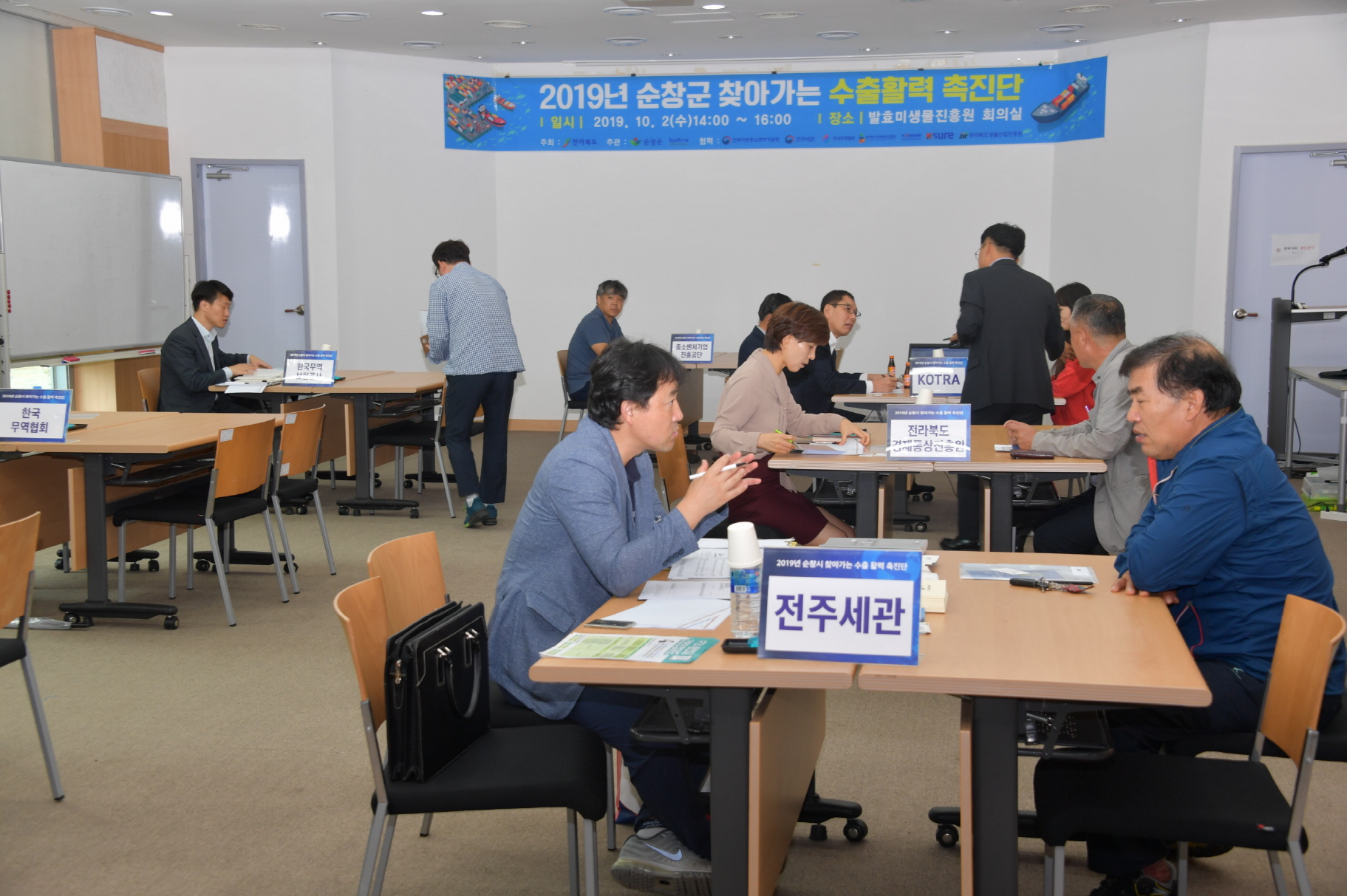 - 2일 발효미생물진흥원 회의실에서 지역농특산물의수출을 돕기 위해 ‘찾아가는 수출활력 촉진단’ 컨설팅을 개최했다. 이번 컨설팅은 중소벤처기업부와 전북도, 순창군이 주최해 관내 수출을 하고 있거나 수출에 관심이 있는 업체를 대상으로 기업-기관 간 1:1 상담으로 현장에서 애로사항을 해결코자 마련됐다.이날 행사에 전북코트라지원단, 전북지방중소벤처기업청, 전주세관, 한국무역보험공사, 한국무역협회, 중소벤처기업진흥공단 등 6개 수출유관기관이 참여했으며, 지역 10여개의 업체들이 컨설팅을 받았다.-2019년 10월 02일-