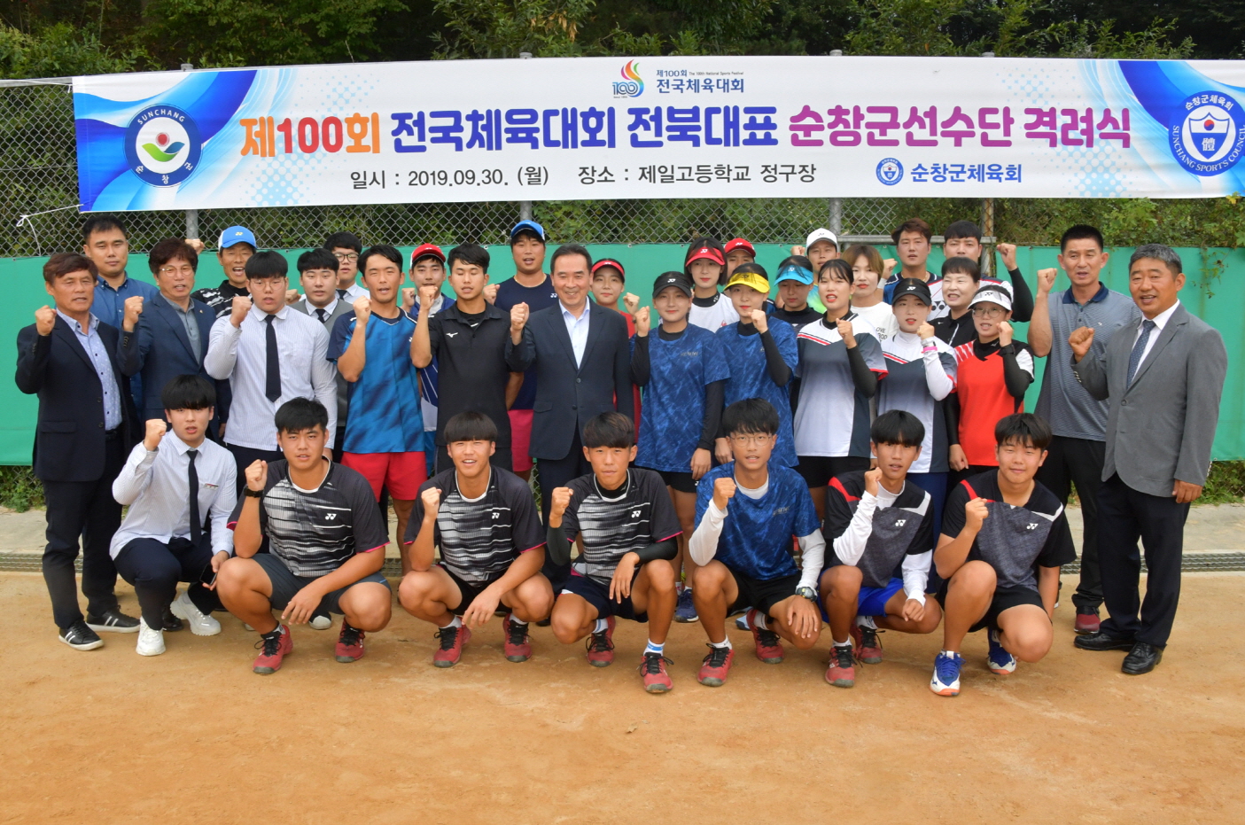 - 오는 10월 4일부터 10일까지(7일간) 서울특별시에서 개최되는 제100회 전국체전에 전라북도를 대표해서 출전하는 순창군선수단 격려식을 30일 오후 2시 순창제일고 정구장에서 가졌다. 이번에 출전하는 선수단은 정구 남자일반부 군청팀 6명, 여자일반부 6명, 남자 고등부 6명, 여자 고등부 7명(제일고), 역도 남자 고등부 4명(순창고) 등 2개종목에 코치 등 34명이 도 대표로 참가하여 실력을 겨룰 계획이다. -2019년 09월 30일-