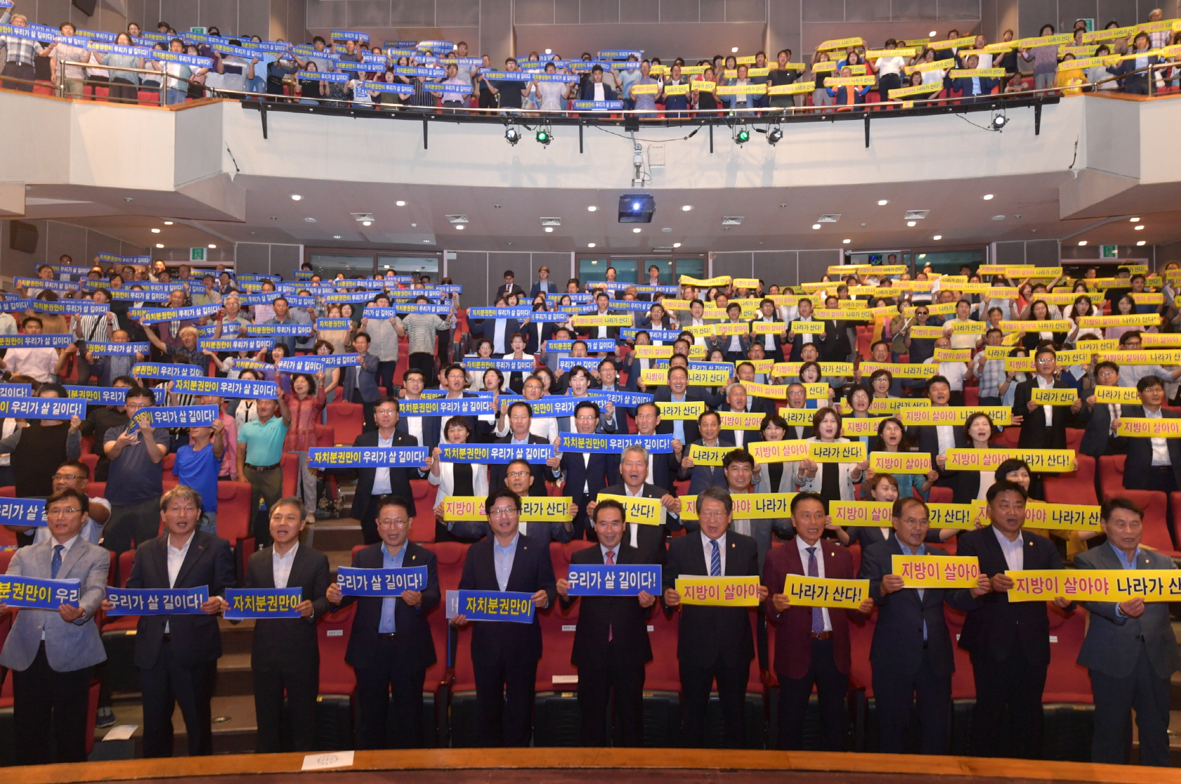 - 6일 익산시 솜리문화예술회관에서 전라북도 14개 시·군 시장, 군수, 의장, 전북도민 등 600여명이 참석한 가운데 `전북도민과 함께하는 자치분권 결의대회`가 열렸다.전북시장군수협의회(회장 황숙주)가 주최하고, 전국시장군수구청장협의회(대표회장 염태영)와 익산시(시장 정헌율)가 지원, 전북시군의회의장협의회(회장 박병술)가 함께했다. 이날 결의대회는 행사의 배경과 앞으로 추진해야 할 방향에 대한 정헌율 익산시장의 기조연설을 시작으로, 기초지방자치단체 중심의 재정분권의 필요성에 대한 강인재 원장의 강연, 결의문 낭독, 카드섹션의 퍼포먼스가 진행됐다. -2019년 09월 06일-