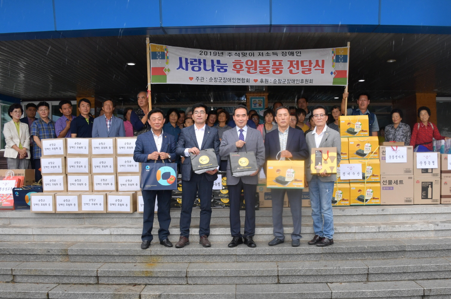 - 순창군 장애인후원회(회장 설재천)는 9일 11개 읍·면사무소와 지체·청각·시각 등 장애인단체별로 대상자를 추천받아 생활이 어려운 저소득 장애인 125세대에 돼지고기, 선물세트, 화장지, 생활용품 등(700만원 상당)을 전달했다.이날 행사에는 순정축협, 순창농협, 순창농협 군지부, 순창MG새마을금고, 순창군 산림조합, 전이수산, 순창 정마트 등 기관 및 사업체들이 후원물품을 제공하여 어려운 이웃들의 정겨운 추석명절 보내기에 동참했다. 2019년 09월 09일-