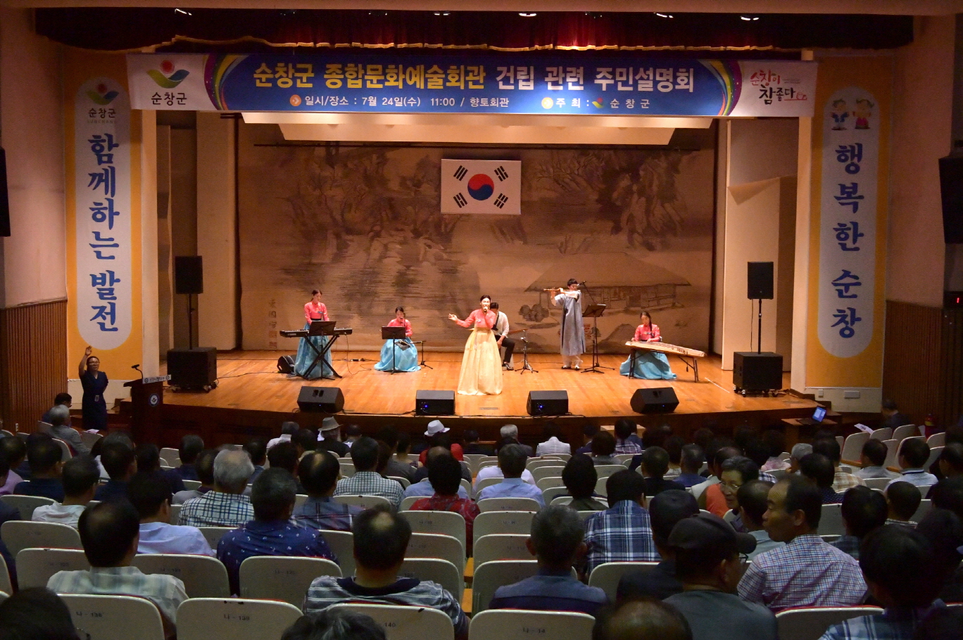 - 24일 향토회관에서 `순창군 종합문화예술회관 건립` 관련 주민설명회를 가졌다.이날 황숙주 순창군수를 비롯, 정성균 순창군의장, 순창군의원, 사회단체장, 주민 등 총 500여명이 참석한 가운데 퓨전국악공연 나니레의 식전공연을 시작으로, 인사말씀, 경과보고, 건립설명 등의 순으로 진행됐다.`종합문화예술회관 건립`은 기존 공연장인 향토회관이 1997년 준공돼 시설 노후화로 대형 공연단 유치에 어려움이 있고, 새로운 문화산업 발전을 위한 토대 마련을 위해서도 전문 공연장 건립 필요성이 높아져 민선 7기 공약사업으로 추진중이다. -2019년 7월 24일-