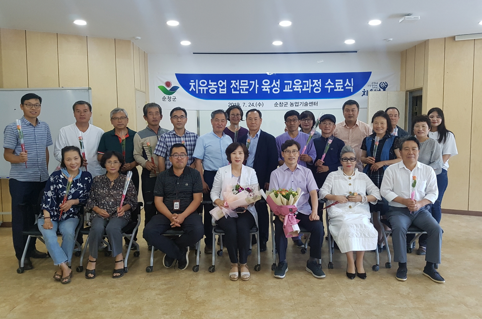 - 24일 농업기술센터 세미나실에서 `치유농업 전문가 육성교육` 수료식을 가졌다.이날 수료식에는 전체 교육생 32명중 출석기준과 교육평가 기준(60점이상 득점)에 충족한 20명에 대해서 수료증을 교부했다. `치유농업 전문가 육성교육`은 치유농장을 운영할 전문인 육성을 위해 순창군이 지난 4월 첫 강의를 시작으로 총 30강좌를 개설해 진행했다. -2019년 7월 24일-