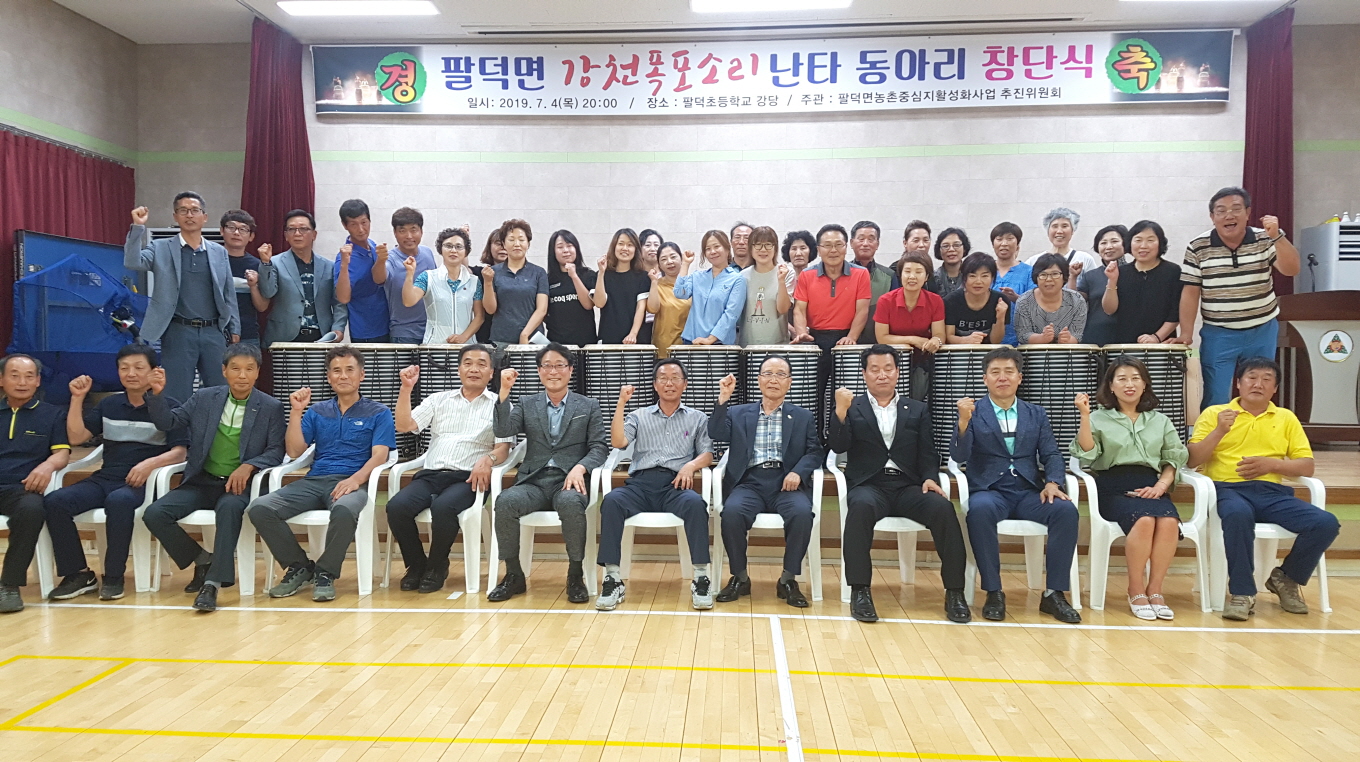 - 순창 팔덕면(면장 김철욱)이 4일 면민들로 구성된 난타 동아리 창단식을 가졌다.이날 창단식에는 관내 기관장, 사회단체장, 회원 35명 등 총 60여명이 참석한 가운데 경과보고, 축사, 다과회 등의 순으로 진행됐다.이번 동아리 창단은 농촌중심지 활성화사업(위원장 김진규) 일환으로 추진된 난타 교육이 지역내에서 높은 인기를 누리며 동아리 창단으로까지 이어지게 됐다. -2019년 7월 4일-