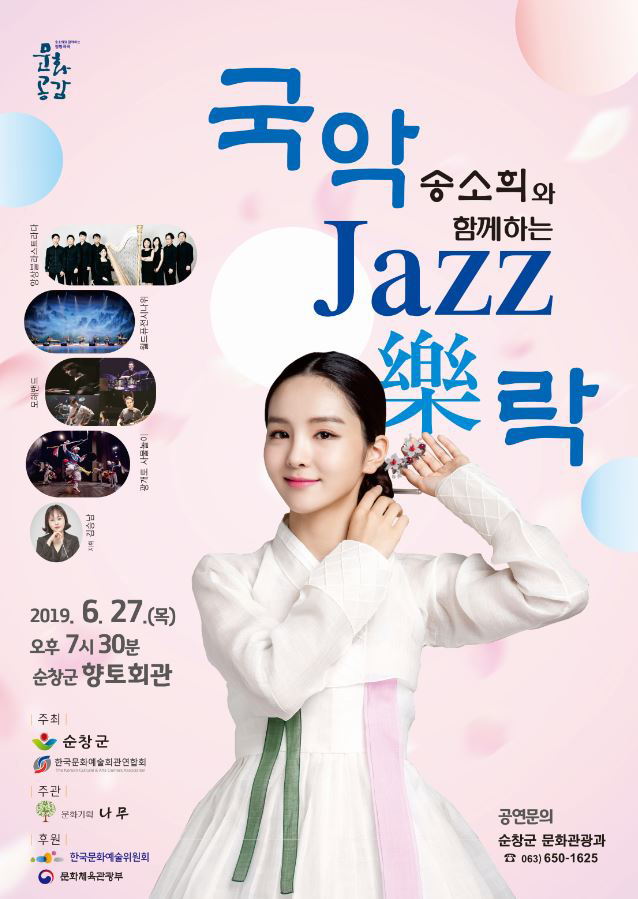 - 오는 27일 순창 향토회관을 찾아 군민들에게 국악신동 `송소희와 함께하는 국악 재즈 樂락` 공연을 선보인다.이번 공연은 지난 2월 한국문화예술위원회와 문화관광체육부가 후원하고 한국문화예술회관연합회 주최로 진행한 `방방곡곡 문화공감사업`에 순창군이 선정되어 성사됐다. 공연 시작시간은 저녁 7시 30분이며, 군민들을 위해 입장료는 무료로 진행한다. 문의 문화관광과(☎650-1625) -2019년 6월 21일-