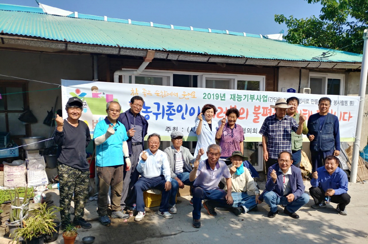 - 순창군 귀농귀촌협의회(회장 김민성)에서 ‘귀농·귀촌인이 여러분의 불편을 수리해드립니다’란 표어를 내걸고 2019년 재능기부 나눔 사업을 진행했다. 협의회 복흥면 지회에서 재능기부 발대식을 시작으로 각 면별 지회에서 간단한 집수리부터 반찬봉사 등 다양한 재능기부 활동을 펼치고 있다. 구림면 지회는 마루가 습을 받아 무너지기 일보직전인 구림면 한 농가를 방문해 회원들이 나서서 마루를 걷어내고, 전면 보수 공사를 진행했다. 금과면 지회는 직장 다니는 남성회원들이 많아 여성회원 중심으로 반찬 나눔 봉사활동을 오는 7월부터 진행할 계획이다. -2019년 6월 25일-