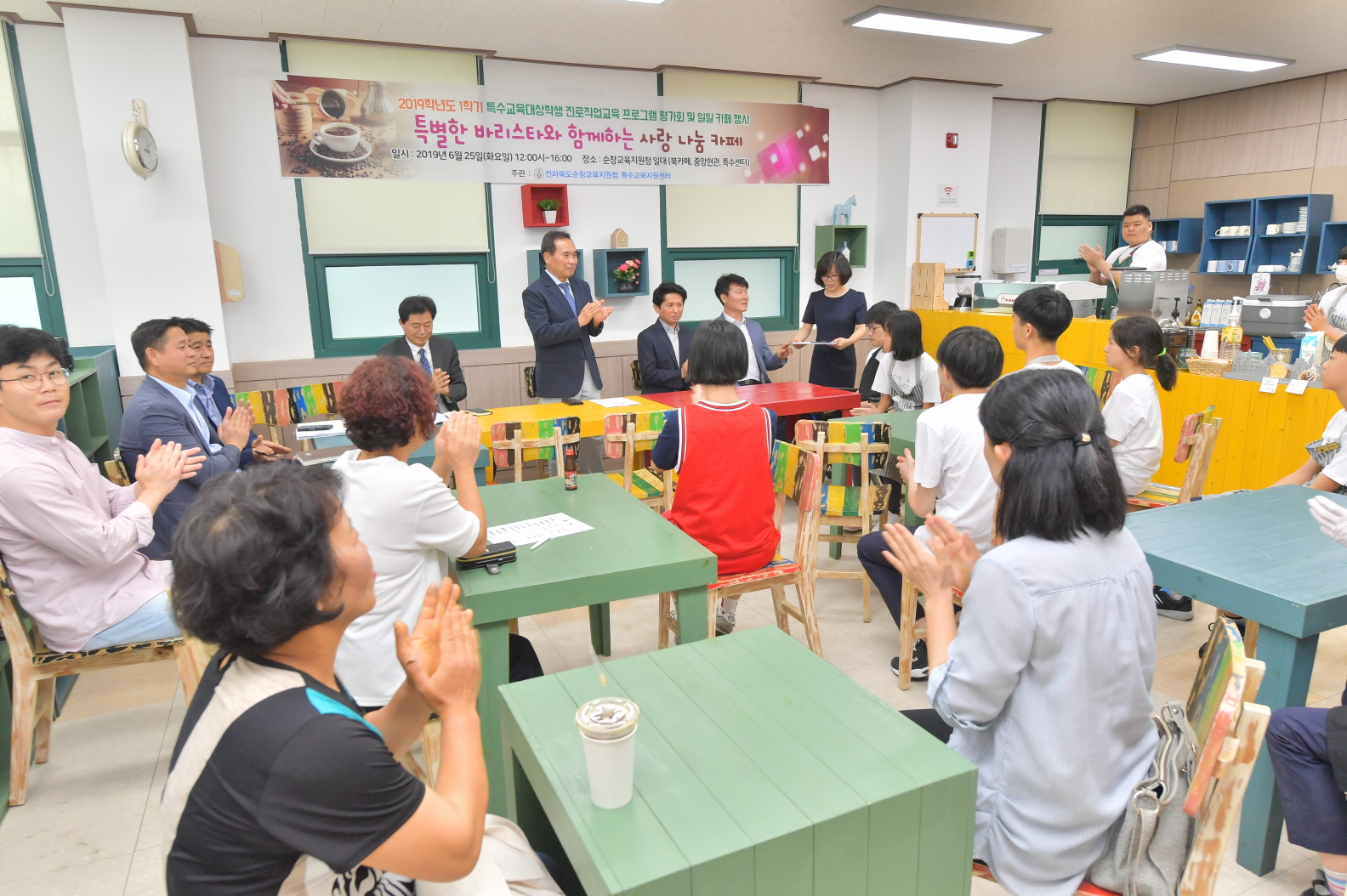 - 황숙주 군수는 25일 순창교육지원청 북카페에서 관내 특수교육대상 학생과 학부모 50여명 참석한 가운데 간담회를 가졌다. 이 자리는 황 군수의 제안으로 성사된 것으로 관내 특수교육대상 학생들의 애로사항을 들어보고 군이 지원할 수 있는 방안이 없는 지 모색하기 위해 마련됐다.특히 이날 황 군수는 간담회 장소에서 열리고 있는 `바리스타와 함께하는 사랑나눔 카페`에서 한창 직업체험중인 특수교육학생들에 대한 따뜻한 격려도 잊지 않았다. -2019년 6월 25일-