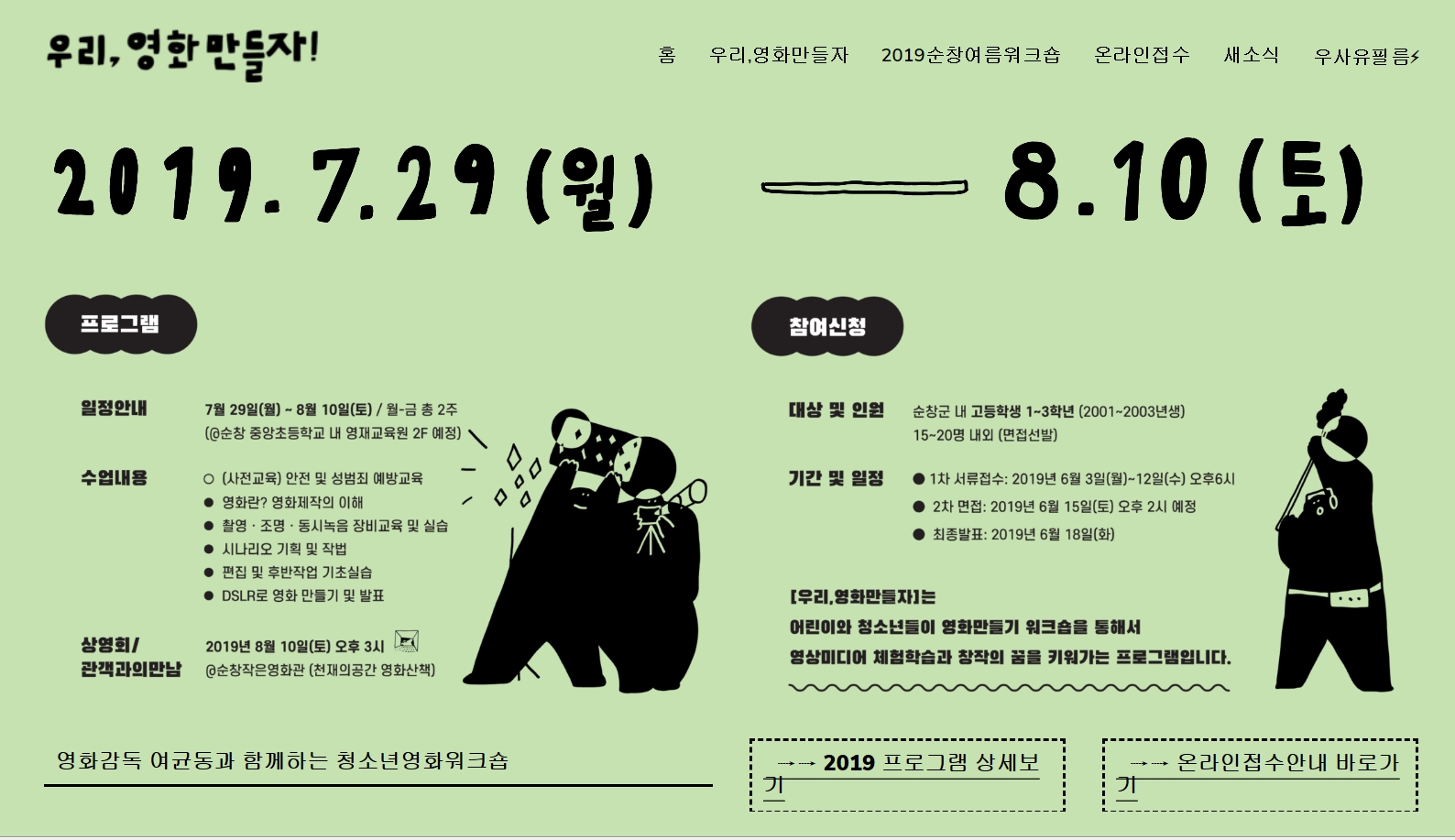 - 순창군이 한국을 대표하는 여균동 감독을 초청해 영화제작에 관심 있는 청소년의 꿈을 적극 지원한다.최근 미디어 산업의 급속한 성장에 대응하고자 우사유필름에 여균동 감독을 초청, 순창 단지영상법인(대표 김준)과 함께 오는 7~8월에 관내 고등학생을 대상으로 ‘우리, 영화 만들자’란 주제로 영상 아카데미를 운영한다. 총 10회에 걸쳐 운영될 영상아카데미 참여 학생을 오는 12일까지 모집한다. 대상자는 관내 고등학생 1~3학년으로, 온라인(www.wooyoungza.com)으로만 접수 가능하며, 1차 서류 심사와 오는 15일 면접을 거쳐 최종 대상자를 18일에 발표한다. -2019년 6월 05-