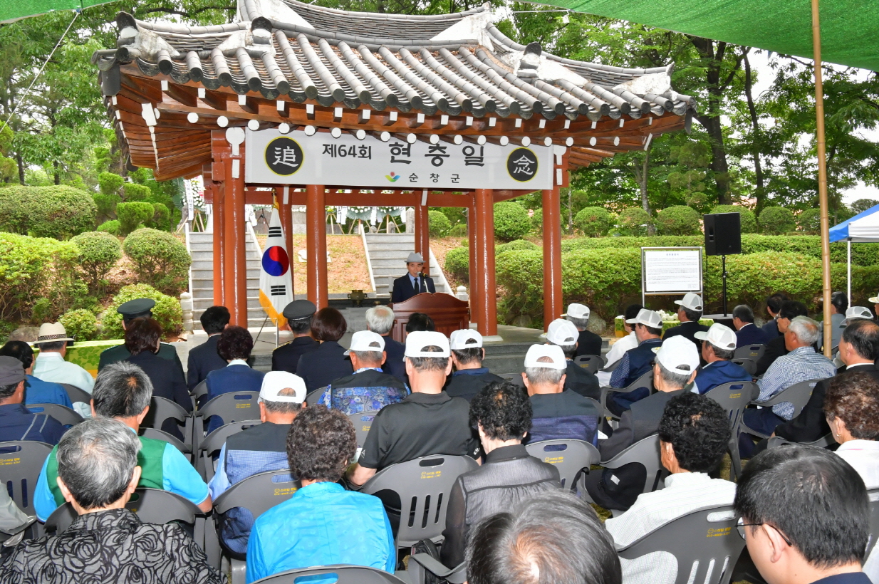 - 순창군이 6월 호국ㆍ보훈의 달을 맞아 국가를 위해 헌신하신 순국선열과 호국영령의 숭고한 희생정신을 기리기 위해 6일 순창제일고 충혼탑에서 제64회 현충일 추념행사를 가졌다.이날 황숙주 군수를 비롯 관내 기관단체장, 보훈회원 및 유가족, 공무원 등 300여명이 참석한 가운데 순국선열 및 호국영령에 대한 묵념과 헌화 및 분향, 유공자 표창, 추념사, 헌시편지 낭독, 현충일 노래 제창, 조총발사 등의 순으로 치러졌다. -2019년 6월 06-