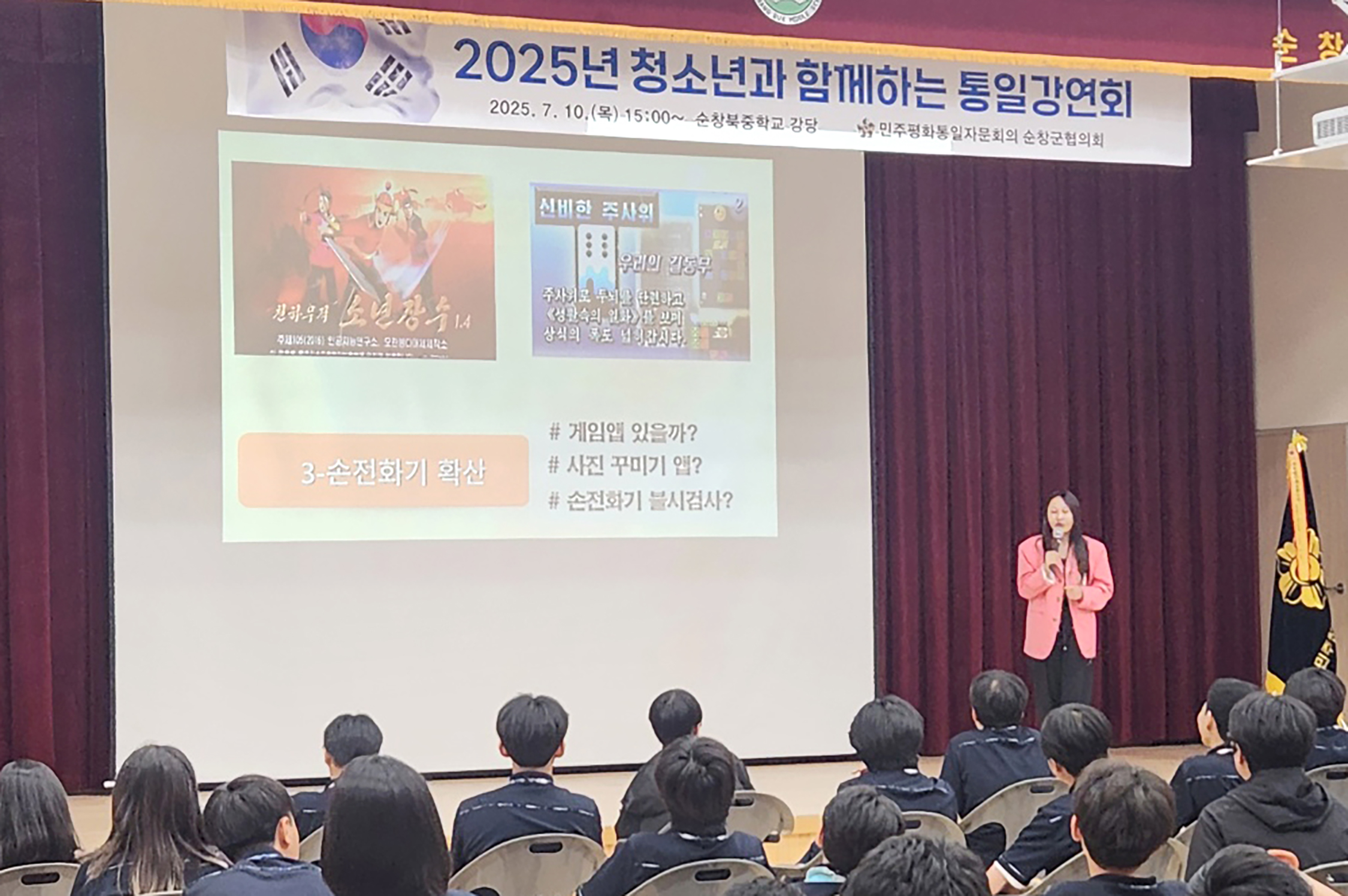- 민주평화통일자문회의 순창군협의회(회장 서애숙)는 10일 순창북중학교에서 전교생을 대상으로‘2025년 청소년과 함께하는 통일강연회’를 개최했다. 이번 강연회는 청소년들의 통일에 대한 관심과 이해를 높이고 평화의 가치를 함께 공유하기 위해 마련된 자리로, 순창북중학교 강두희 교장을 비롯한 교직원과 전교생 150여 명이 참석한 가운데 진행됐다. -2025년 7월 10일-