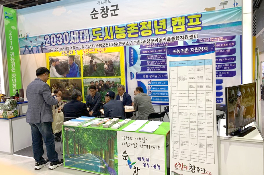 - 순창군은 26부터 28일까지 서울 양재동 AT센터에서 `2019 귀농귀촌 청년창업 박람회`에 참가해 도시민 유입에 열을 올렸다.이번 박람회에 순창군은 귀농귀촌지원센터 양환욱 센터장을 비롯해 공무원과 귀농귀촌협의회 등 10여명이 참가해 도시민의 귀농상담에 적극 대응했다.순창군은 이번 박람회 기간 동안 31건에 51명의 귀농귀촌 상담을 진행했으며, 청년캠프 6팀 18명, 실습농장 2팀 4명 등을 유치하는 실적을 올렸다. -2019년 4월 27일-