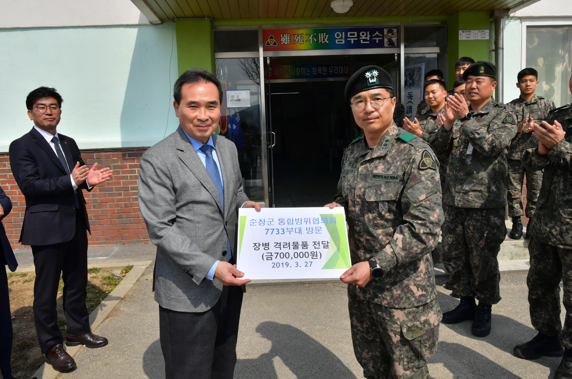 - 순창방위를 책임지고 있는 순창군 통합방위협의회(의장 황숙주 순창군수)가 이례적으로 순창.임실대대 현장에서 회의를 개최했다.27일 황숙주 순창군수를 비롯한 통합방위협의회원 등 30여명이 순창.임실대대를 방문해 현장에서 회의를 개최하고 군 장병을 격려했다.이날 회의는 먼저 통합방위협의회원 등 30여명이 임실에 위치한 순창.임실대대로 이동한 후, 황숙주 군수가 김수일 대대장에게 군 장병들을 위한 피자와 통닭 등 간식 위문품을 전달했다. 이어 기념촬영을 하고, 본격 회의시간을 가졌다. 회의에서는 순창.임실대대 현황 청취와 2019년 1분기 대대 훈련평가, 2분기 대대 훈련계획 등을 보고 받고, 기타사항을 논의했다. -2019년 3월 27일-