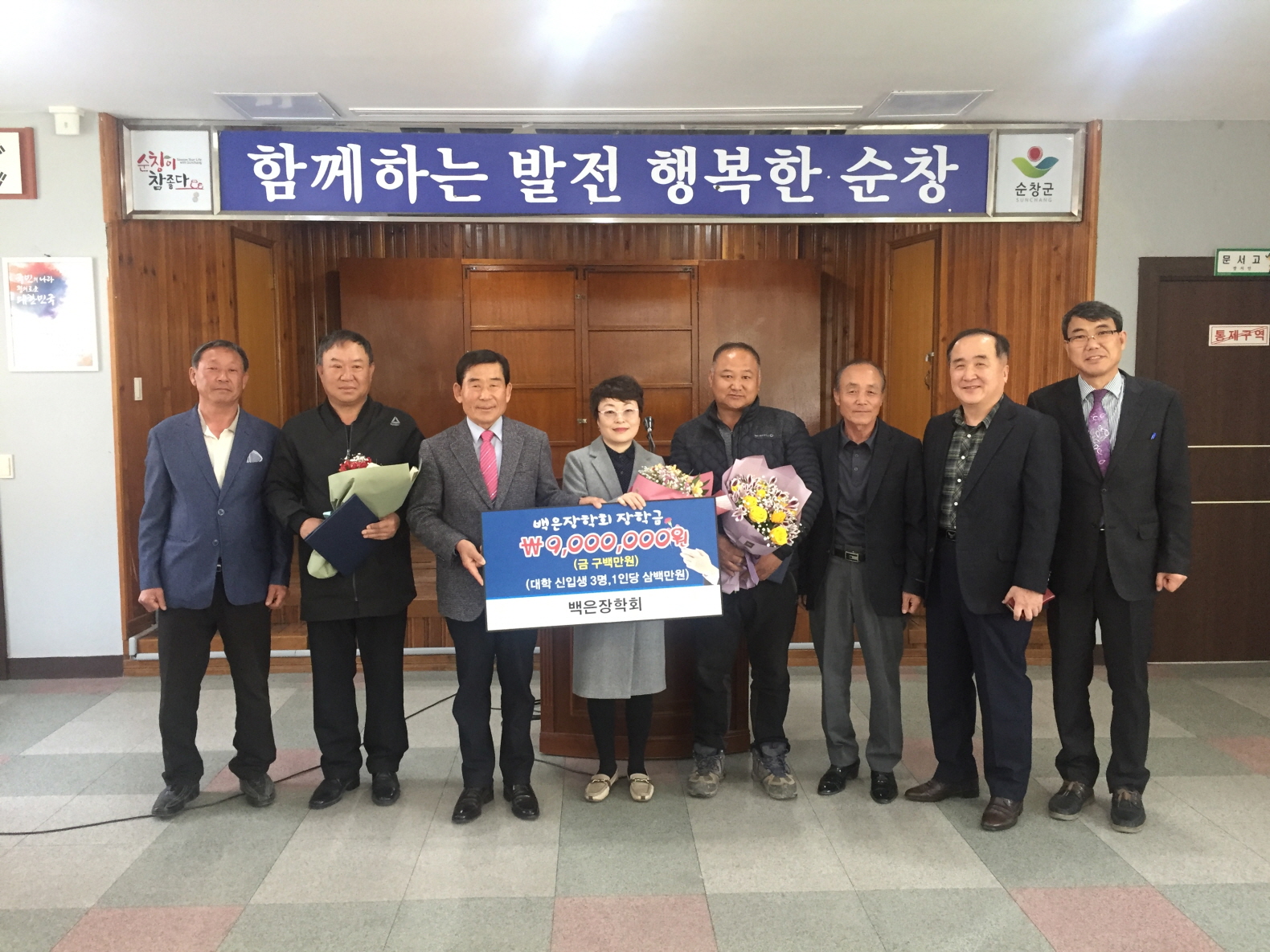 - 순창군 백은장학회(이사장 설동일)는 대학에 입학하는 신입생 중 3명을 선발해 장학금 3백만원씩을 전달했다.백은 장학회는 순창 쌍치면 출신 백은 김상열 회장이 성적이 우수하면서도 가정형편이 어려워 공부를 하지 못하는 학생들을 위하여 써달라고 2억원을 기탁함에 따라 지난 2016년 12월에 설립됐다. -2019년 3월 29일-