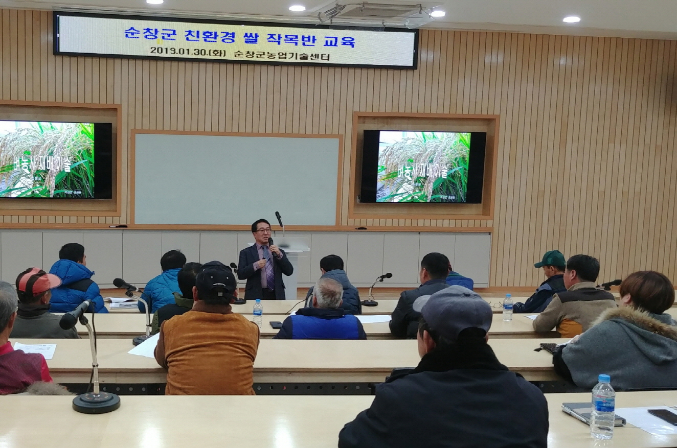 - 순창군이 친환경 농업 확대를 위해 읍면을 순회하며 ‘친환경벼 안정생산 재배기술’ 교육이 성황리에 마쳤다.이번 교육은 이인(전 전남농업기술원 근무) 강사를 초빙해 진행됐으며, 신동진 벼의 특성, 친환경 벼에 발생하는 병충해와 예방방법, 우렁이 농법의 주의할 점 등 폭넓은 강의로 진행됐다. -2019년 2월 8일-