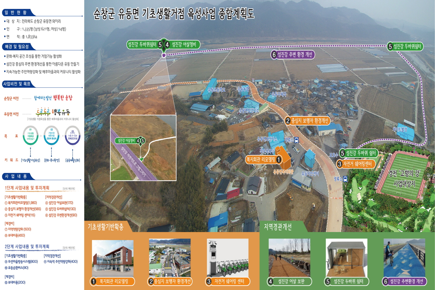 - 기초생활거점육성사업은 면 소재지를 경제‧사회‧문화적 기능을 갖춘 농촌지역의 거점으로 육성하는 사업으로 지난 2012년 순창읍과 복흥면을 시작으로 지금까지 8개 읍면이 이 사업을 완료했거나 추진 중에 있다. 그 동안 추진하지 못했던 유등, 적성, 풍산면 등 3곳이 2022년까지 이 사업을 완료하게 되면 순창군의 11개 읍면 모두가 소재지 정비를 마무리하게 된다. -2019년 2월 12일-