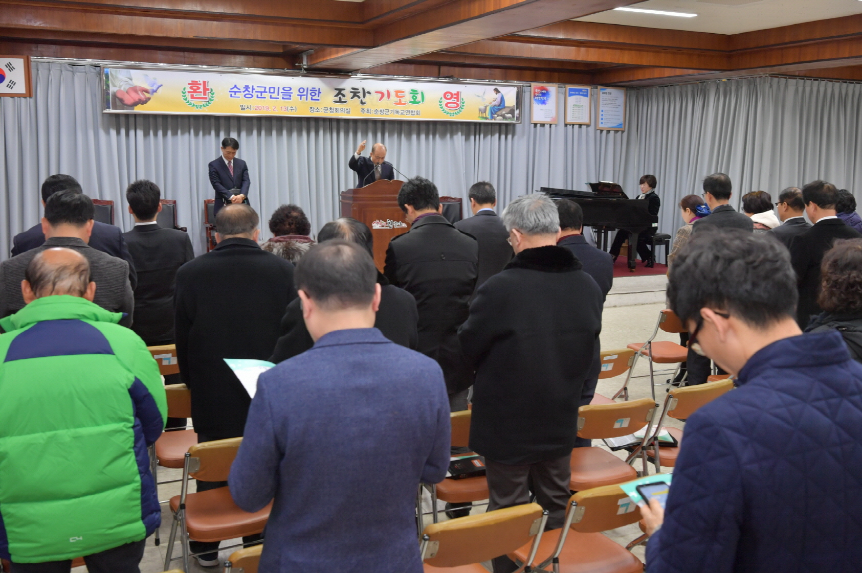 - 순창군의 발전과 안녕을 위한 군민 조찬기도회가 순창군 기독교연합회(회장 송주인 호계교회목사) 주관으로 13일 아침 7시 군청 3층 회의실에서 열렸다. 이날 조찬기도회에는 순황숙주 군수를 비롯 실과소원장, 종교인 등 100여명이 참석한 가운데 순창군 구세군교회 이혁동 사관의 사회속에 김재옥 팔덕교회·전영기 내월교회 목사의 특별기도와 박노갑 유등교회 목사의 축도로 순창군 발전과 안녕을 기원했다. -2019년 2월 13일-