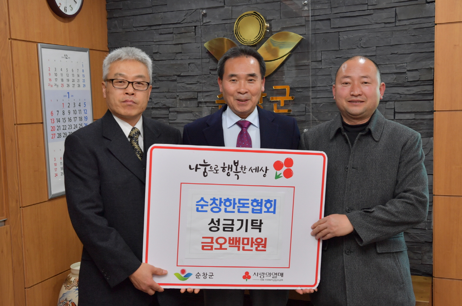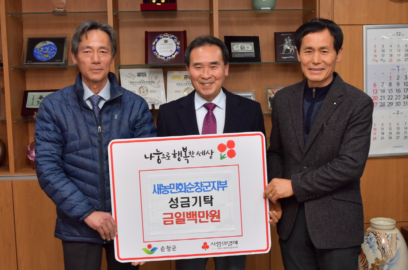 - 30일 순창군청을 찾은 새농민회 임형락 회장은 형편이 어려운 이웃에게 작은 도움이 되길 바란다며 성금 1백만원을 황숙주 군수에게 기탁했다. -2019년 1월 30일-