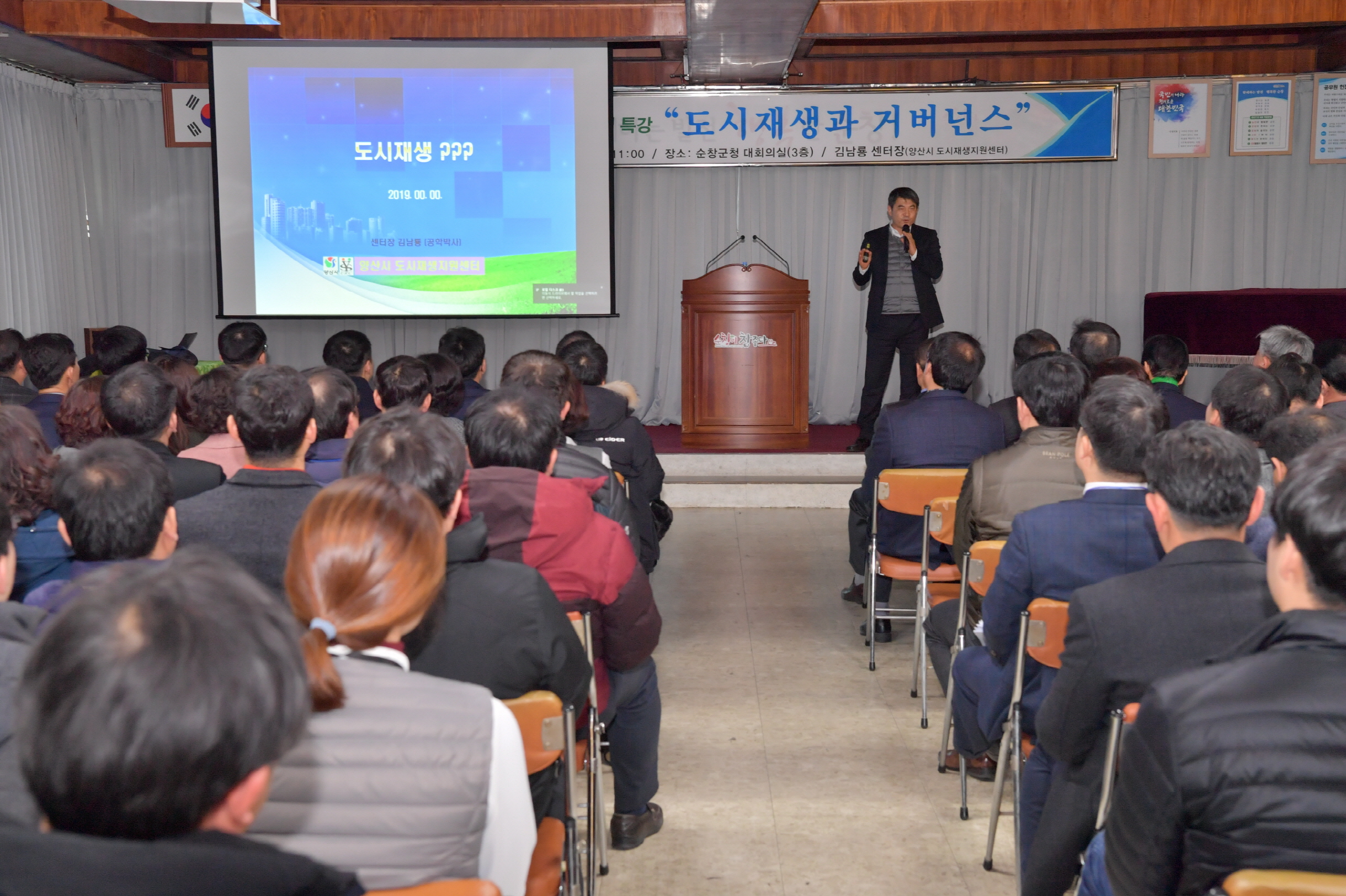 - 1일 군청 3층 회의실에서 도시재생 현장 전문가 김남룡 박사를 초청해 ‘도시재생 뉴딜 사업의 이해’라는 주제로 간부 및 계장급 공무원 200여명을 대상으로 직원 역량강화 교육을 진행했다.도시재생 뉴딜 사업은 단순 주거정비 사업이 아닌 쇠퇴한 도시의 경쟁력을 높이고자 하는 도시혁신 사업으로 순창군이 역점을 두고 있는 핵심사업 중 하나다. -2019년 2월 1일-